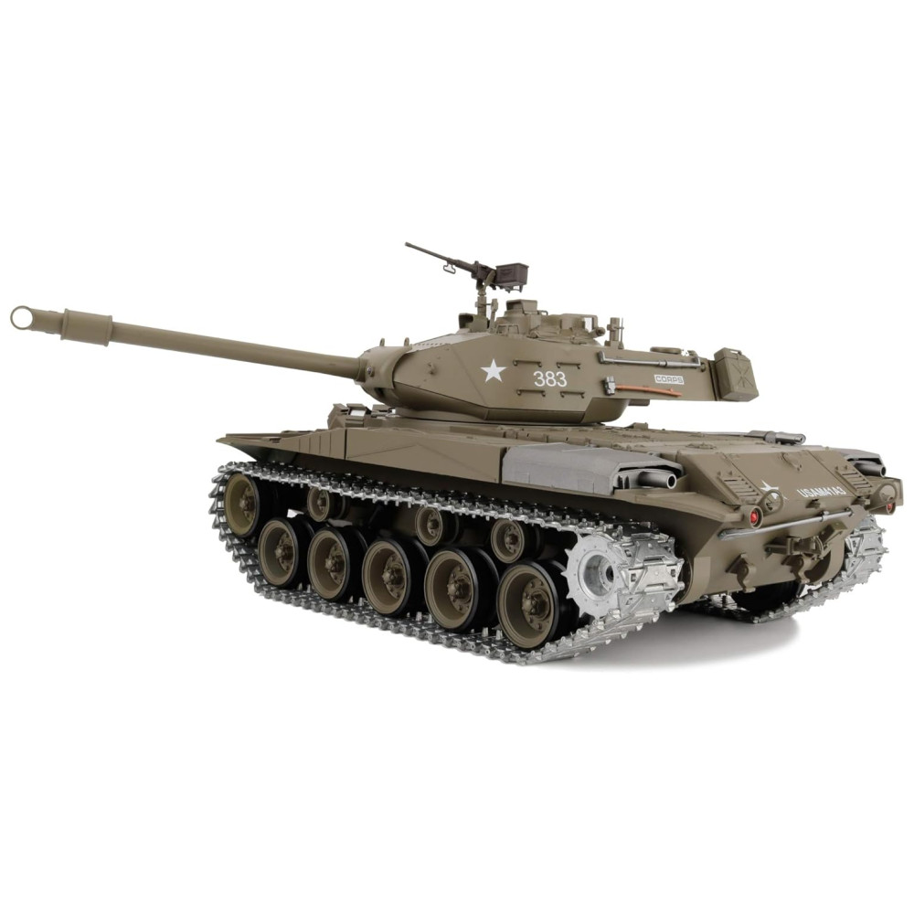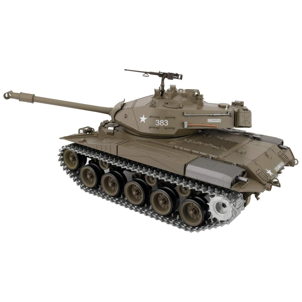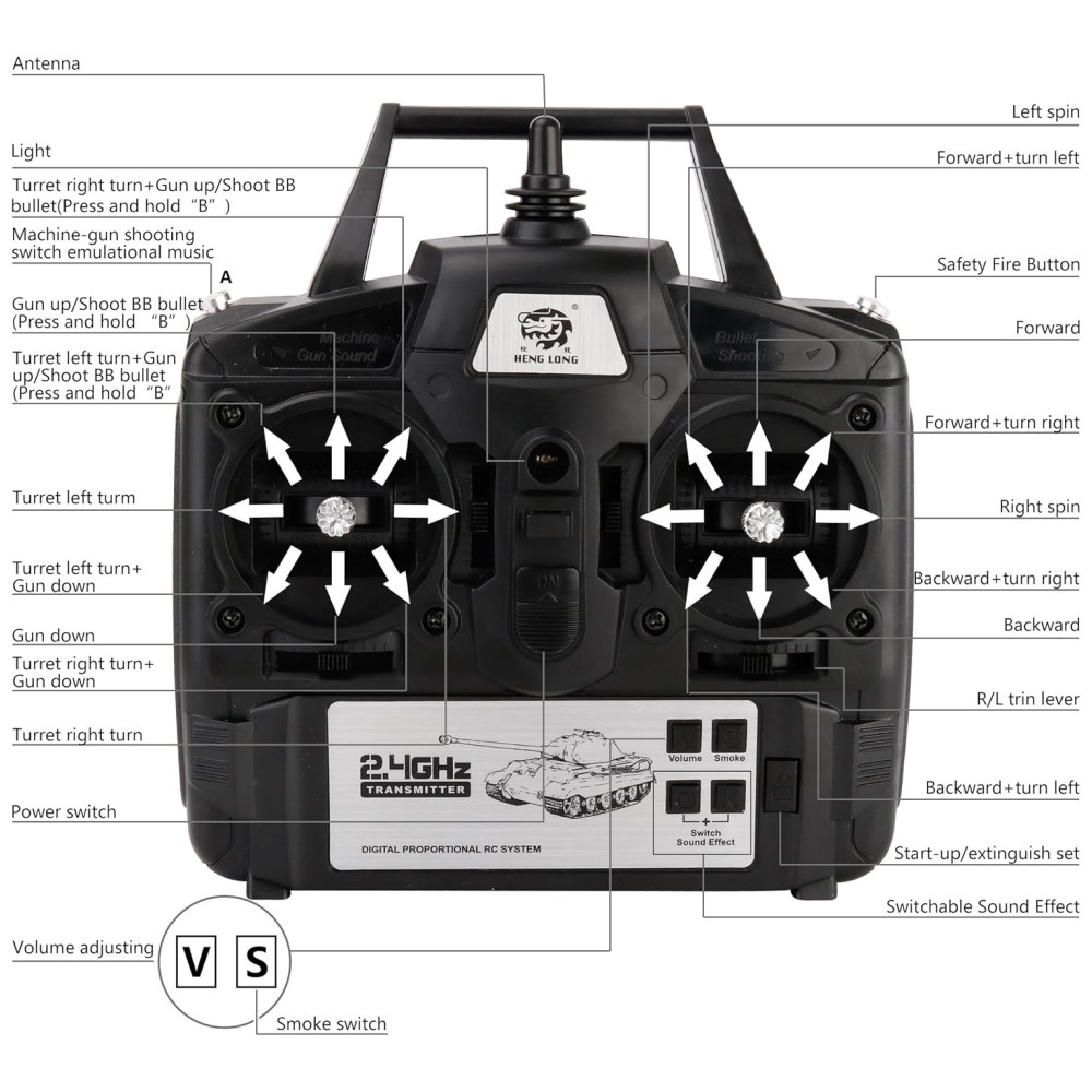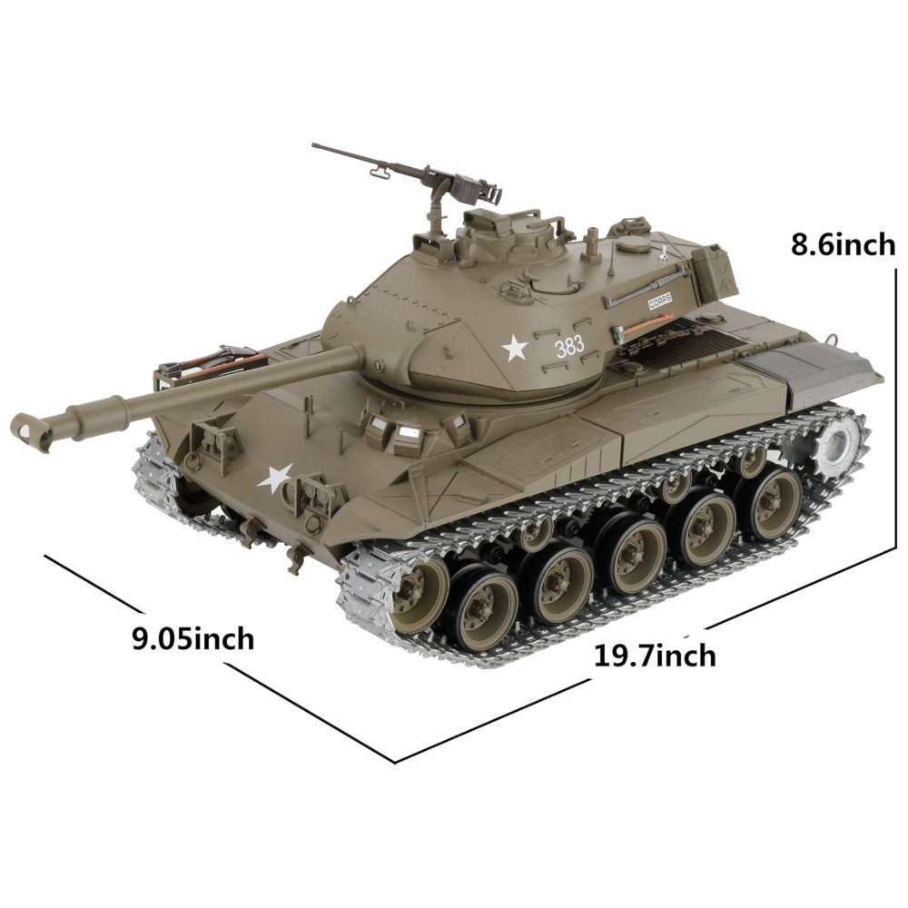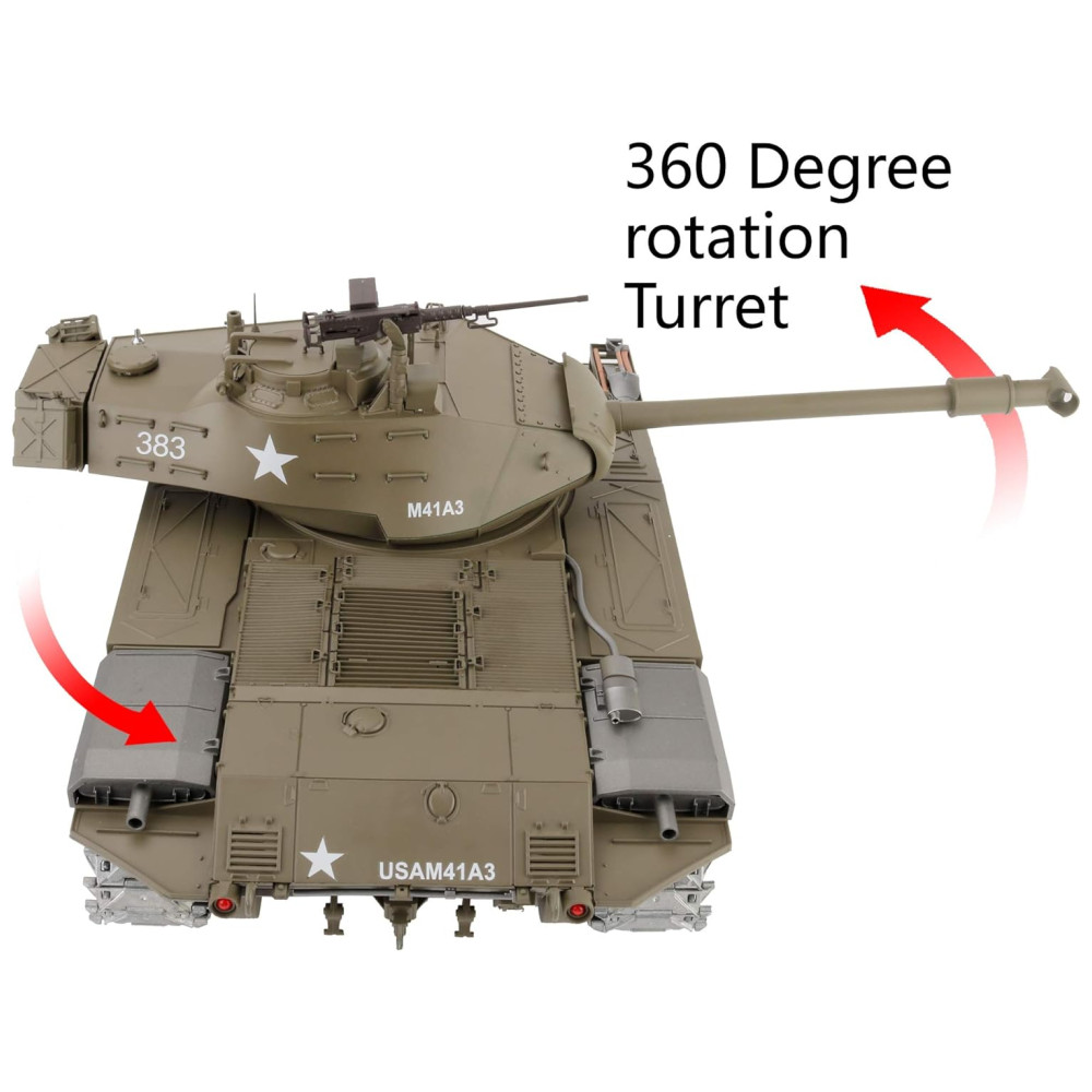 Este tanque de controle remoto apresenta uma caixa de engrenagens de aço atualizada, tornando-o mais resistente ao desgaste e com vida útil multiplicada. Os trilhos e a roda dentada são de metal, enquanto a roda ociosa, a roda de estrada, os pneus e os braços de suspensão são de plástico padrão. A torre giratória pode girar 360 graus e o cano pode ser elevado em até 30 graus. Além disso, o tanque possui um sistema eletrônico completo com controle remoto de fumaça e sistema de som, incluindo simulador de efeitos de fumaça e som de motor e metralhadora. O sistema de controle de rádio de 2,4 GHz suporta muitos tanques semelhantes lutando juntos sem intervenção de rádio. O tanque é movido por uma bateria Nimh recarregável de alta potência de 3800 mah modificada. O comprimento do tanque é de 67,56 cm, a largura é de 23,5 cm e a altura é de 17 cm, com escala 1:16.