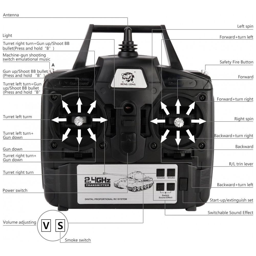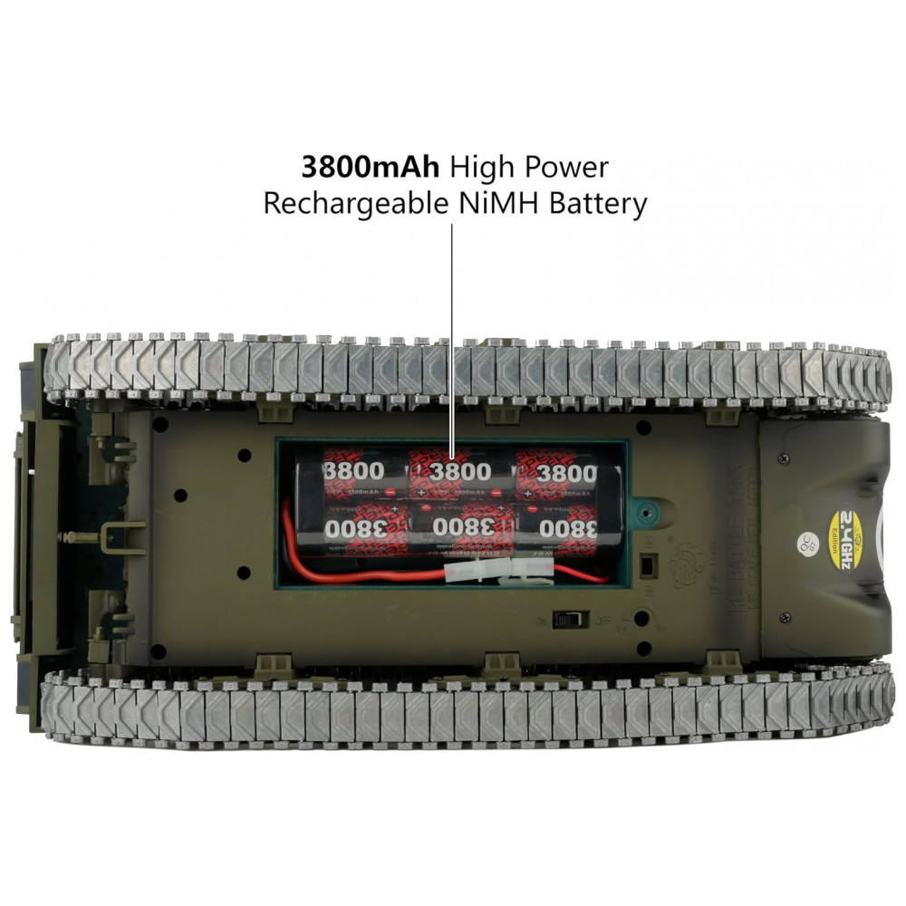 Este tanque de controle remoto possui uma série de atualizações que o tornam mais resistente ao desgaste e com vida útil multiplicada. A caixa de engrenagens é de aço, enquanto os trilhos de lagartas, roda dentada e roda ociosa são de metal. A torre giratória pode girar 360 graus e possui anéis deslizantes elétricos feitos à mão e instalados no tanque. O produto não inclui garantia ou suporte. A bateria recarregável é de alta potência, com 3800 mah. O tanque pode avançar, acelerar para frente e para trás, acelerar para trás e girar, além de ter o cano elevado em 30 graus. A torre pode girar 360 graus e o som do motor e da metralhadora são imitados. O tanque também possui simulador de fumaça e efeitos sonoros mecânicos. O sistema eletrônico é completo, com controle remoto de fumaça e sistema de som. A escala do tanque é de 1:16, com comprimento de 67,56 cm, largura de 23,5 cm e altura de 17 cm. O produto suporta muitos tanques semelhantes lutando juntos sem intervenção de rádio. É importante consultar a nova versão do manual do sistema de controle de rádio de 2,4 GHz, já que a versão antiga está errada.