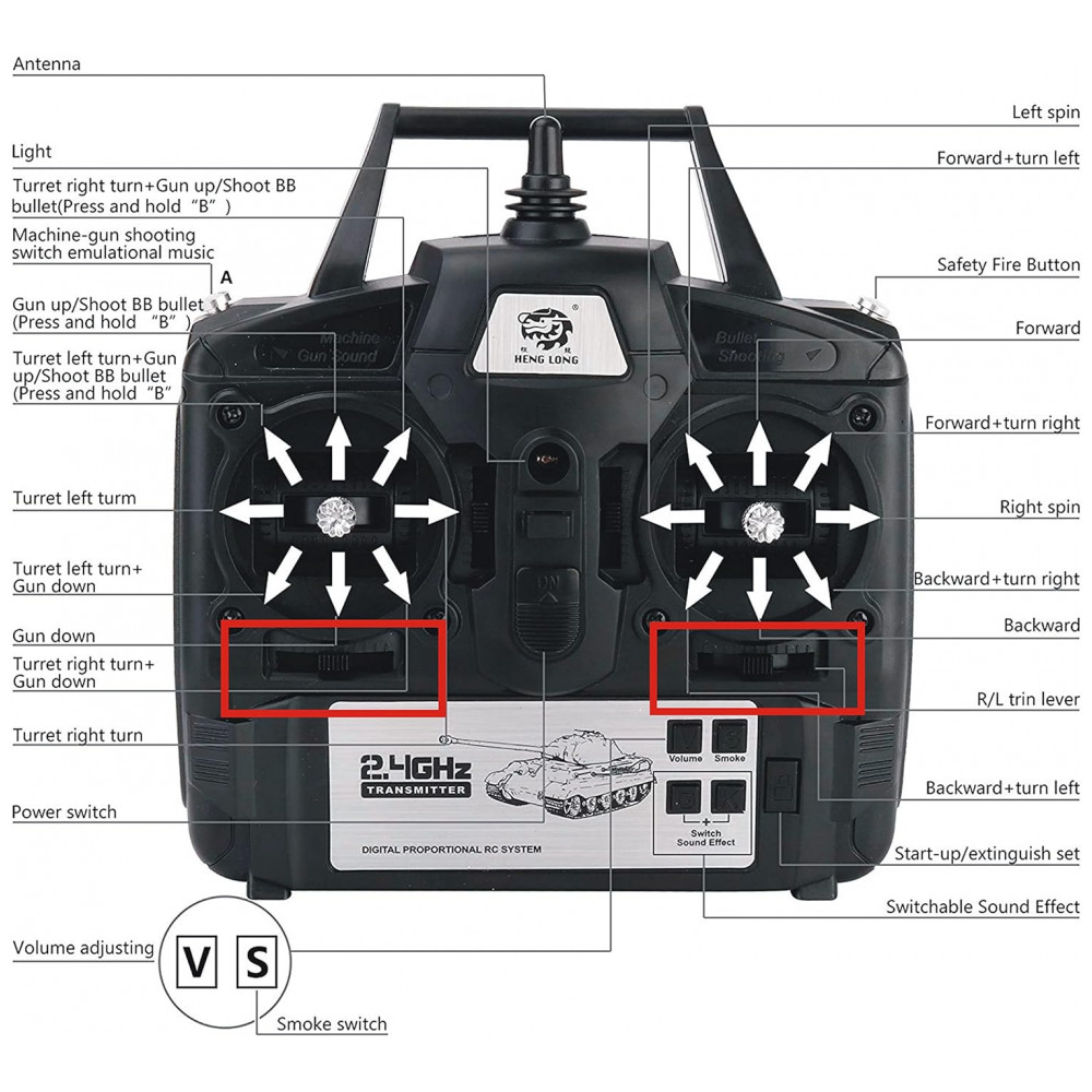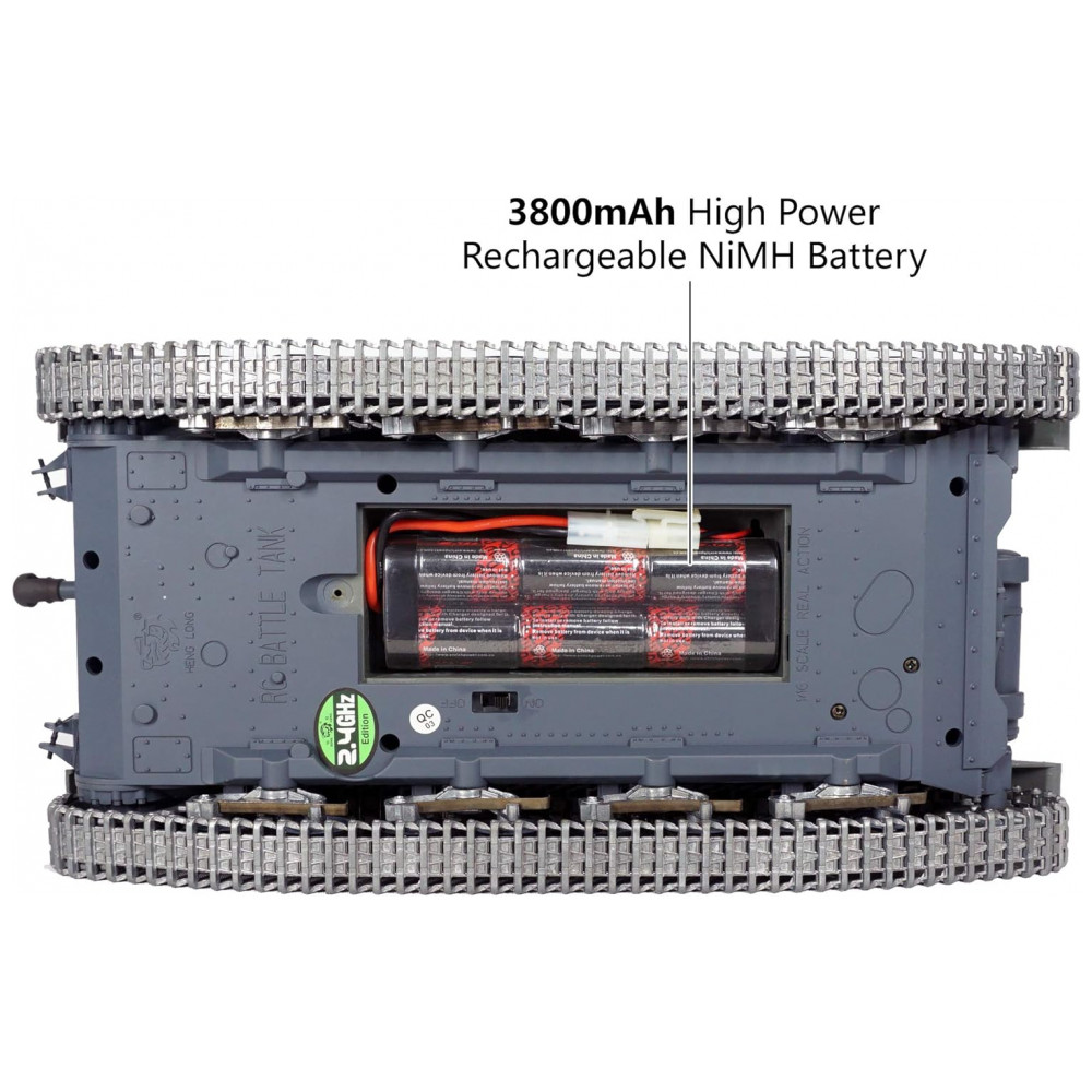 Este tanque de controle remoto possui diversas melhorias em sua estrutura, como uma caixa de engrenagens de aço mais resistente ao desgaste, trilhos de lagartas e roda dentada de metal atualizados, além de rodas ociosas, pneus e braços de suspensão de plástico padrão. Sua torre giratória é capaz de girar 360 graus e o cano pode ser elevado em até 30 graus. O tanque também conta com um sistema eletrônico completo com controle remoto de fumaça e sistema de som, que inclui simulador de efeitos de fumaça, som de motor e metralhadora, além de ações mecânicas imitando um tanque real. O disparo é feito com BBs padrão de 6mm, com efeito sonoro de disparo e simulador de efeitos de fumaça. O sistema de controle de rádio de 2,4 GHz permite que vários tanques semelhantes lutem juntos sem interferência de rádio. O tanque tem comprimento de 67,56 cm, largura de 23,5 cm e altura de 7,5 polegadas, e opera com bateria recarregável Nimh. Vale ressaltar que esta configuração não é padrão de fábrica.