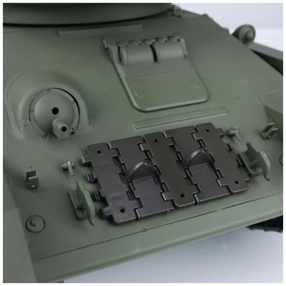 O sistema de combate infravermelho suporta muitos jogadores para combater em uma guerra de tanques. Com aparência em escala do tanque real, direção pivô, torre que gira quase 340 graus e barril de controle para cima e para baixo quase 30 graus, além de luzes de tanque emulacionais de LED. O sistema de som da placa-mãe 7.0 oferece 2 sons para opção, cada ação atua com som mecânico de tanque real. O disparo de pellets BB de 6mm tem ação legal de recuo do casco e efeito sonoro de disparo, com alcance de tiro de 20m. A versão de plástico vem com suspensão de roda de metal. O fumo ocioso é como um tanque real do motor, quando o tanque funciona rápido, a fumaça gradualmente se torna mais, mas você precisa deixar cair líquido no tanque cada vez, deixe cair apenas uma gota ou então quebre. Observe que talvez não possamos enviar líquido para alguns países. O sistema de controle de rádio de 2,4 GHz suporta muitos tanques semelhantes combatendo juntos sem intervenção de rádio.