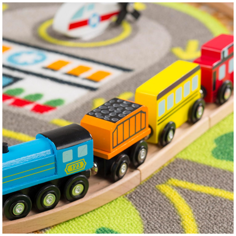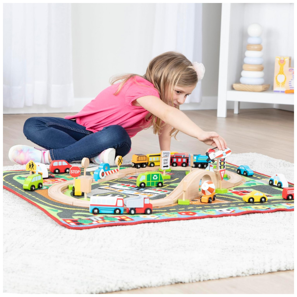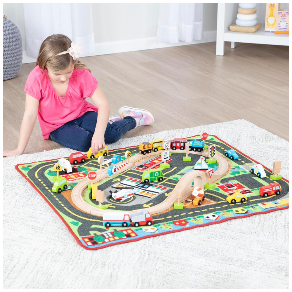 O tapete de atividades multiveículos Deluxe é perfeito para criar um mundo de aventuras sem fim Com 19 veículos, incluindo 13 rodoviários, um helicóptero e um barco, você pode visitar uma estação de trem, corpo de bombeiros, escola, mercado, hospital, centro de reciclagem, lago e muito mais no tapete ilustrado. Além disso, o conjunto inclui 12 sinais de trânsito de madeira que podem ser organizados e reorganizados.