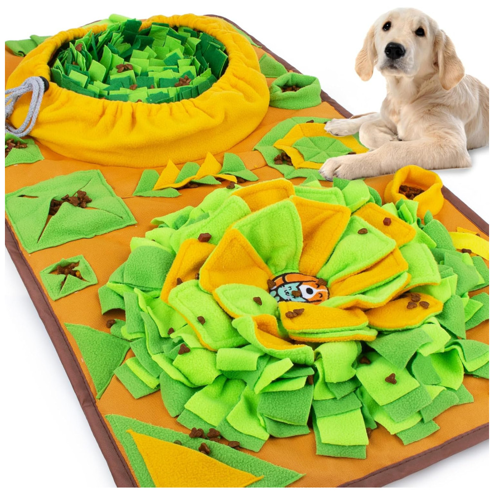 GRANDE E DURÁVEL O grande tapete de snuffle para cães é feito de tecido de alta qualidade com grossas lâminas de grama artificial, durável e adequado para animais de estimação. O fundo é um pano antiderrapante que segura o tapete com eficácia e impede o cão de mover o tapete.Petais e grama são costurados no tapete com linha de algodão grosso.O design é pequeno e pode ser encolhido em uma pequena bolsa de zenamento. Também pode ser pendurado ou colocado de lado quando não estiver em uso, o que é adequado para viagens.