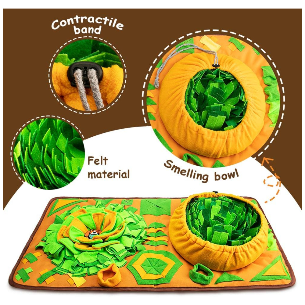 JOGO DE ALIMENTAÇÃO ENGRAÇADA A esteira Snuffle para cães grandes tem uma grande flor com 2 camadas de pétalas de laranja e uma grande grama verde bagunçada que pode esconder grandes pedaços de comida e alimentos de tamanho pequeno facilmente. Para fornecer mais diversão para cachorros adoráveis, colocamos um rangido de BB sob o logotipo no meio e 3 pedaços de papel tocando aleatoriamente na pétala. Então, o som pode atrair a atenção do cão e deixá lo animado enquanto joga o tapete de rapé para animais de estimação.