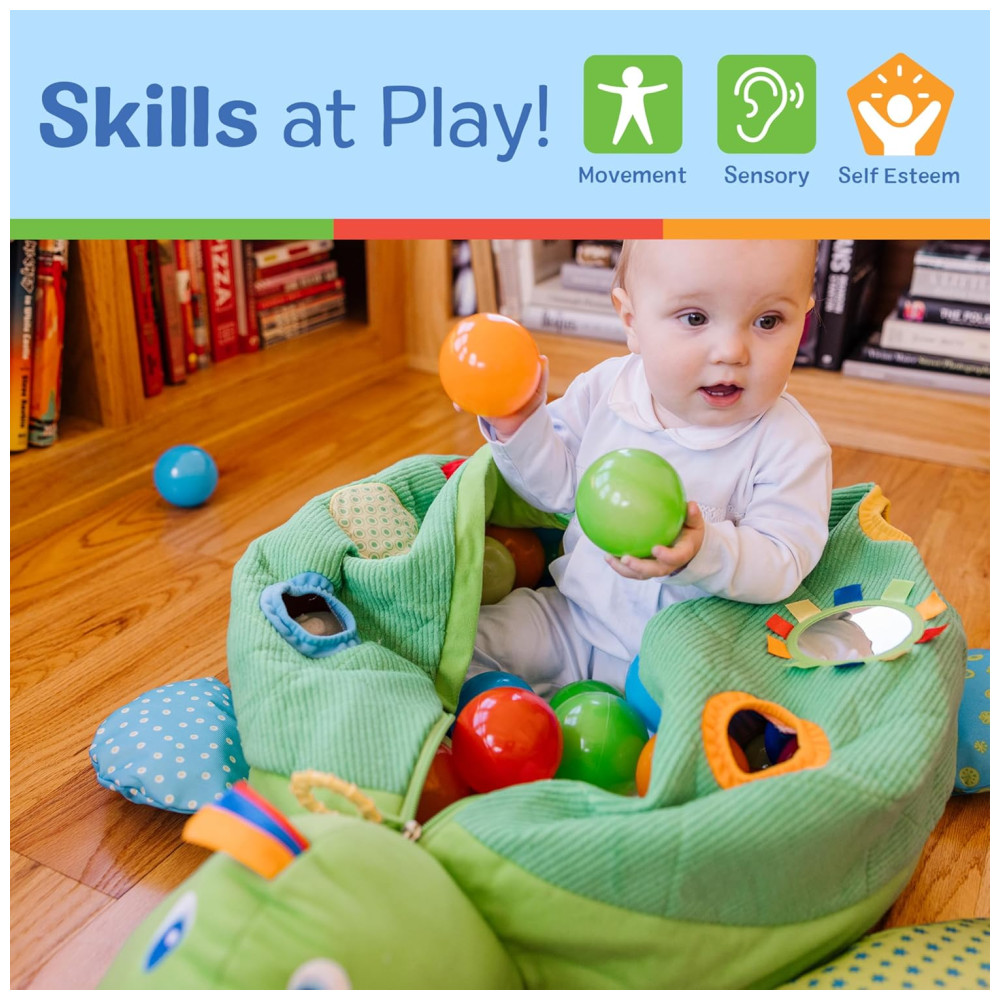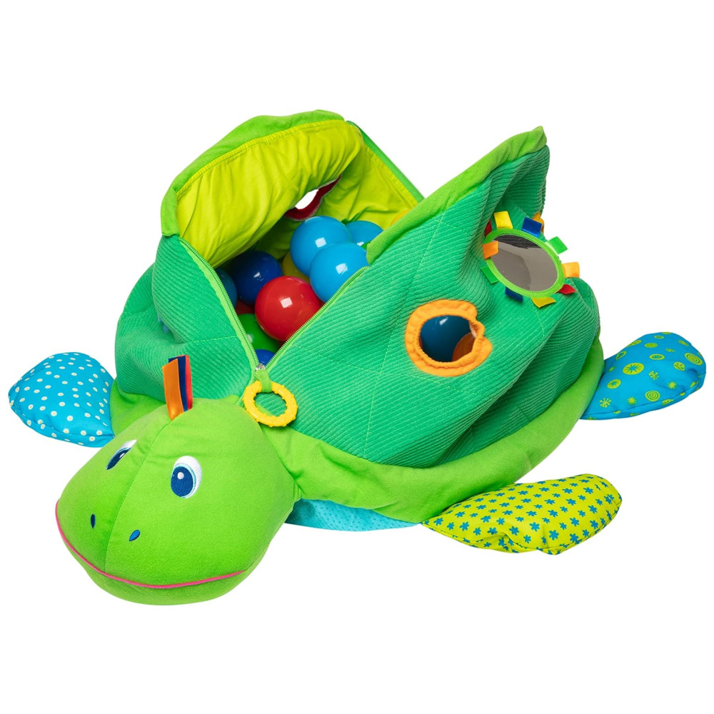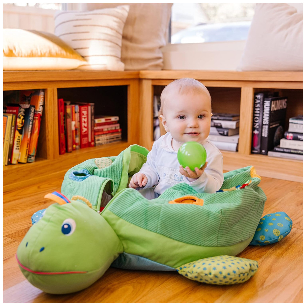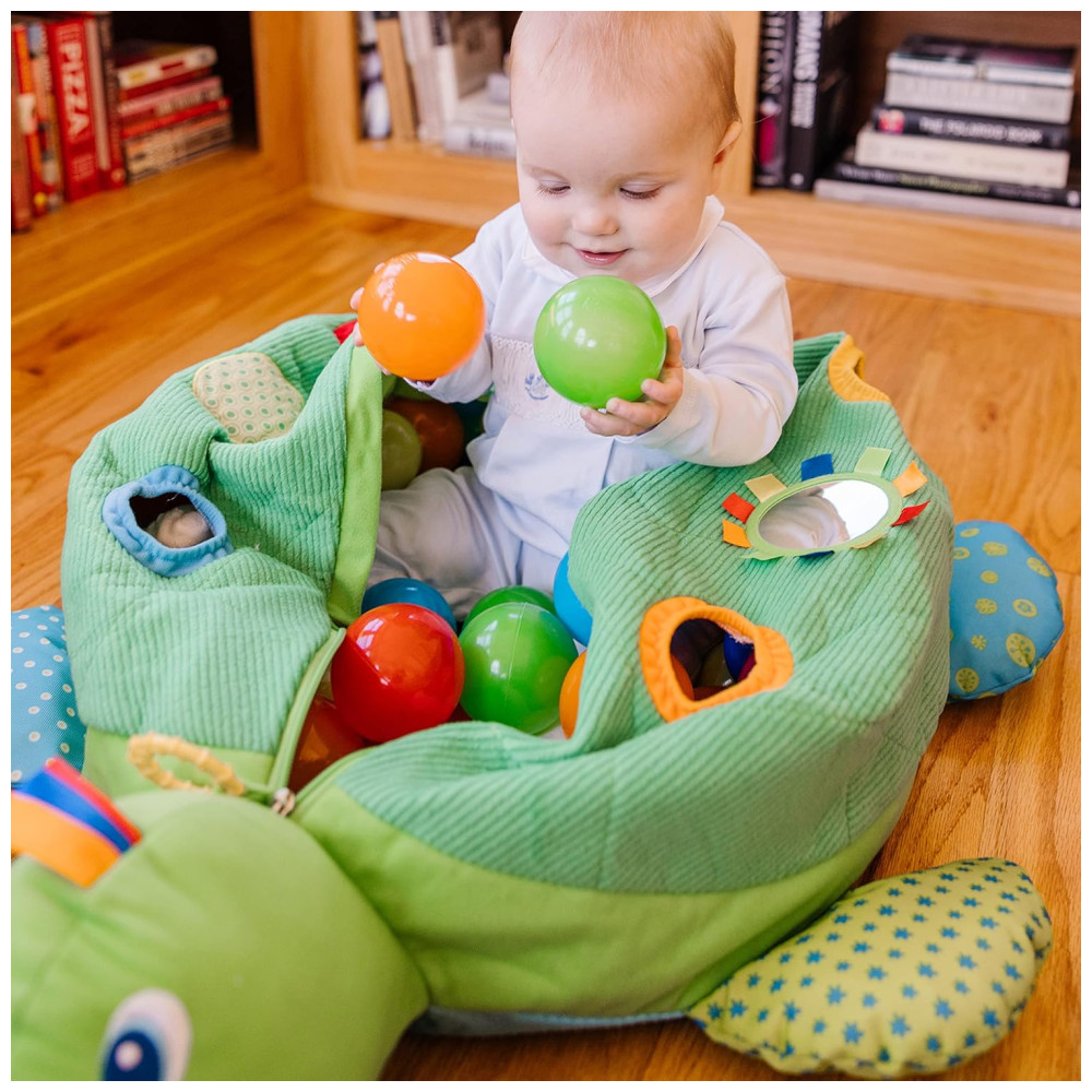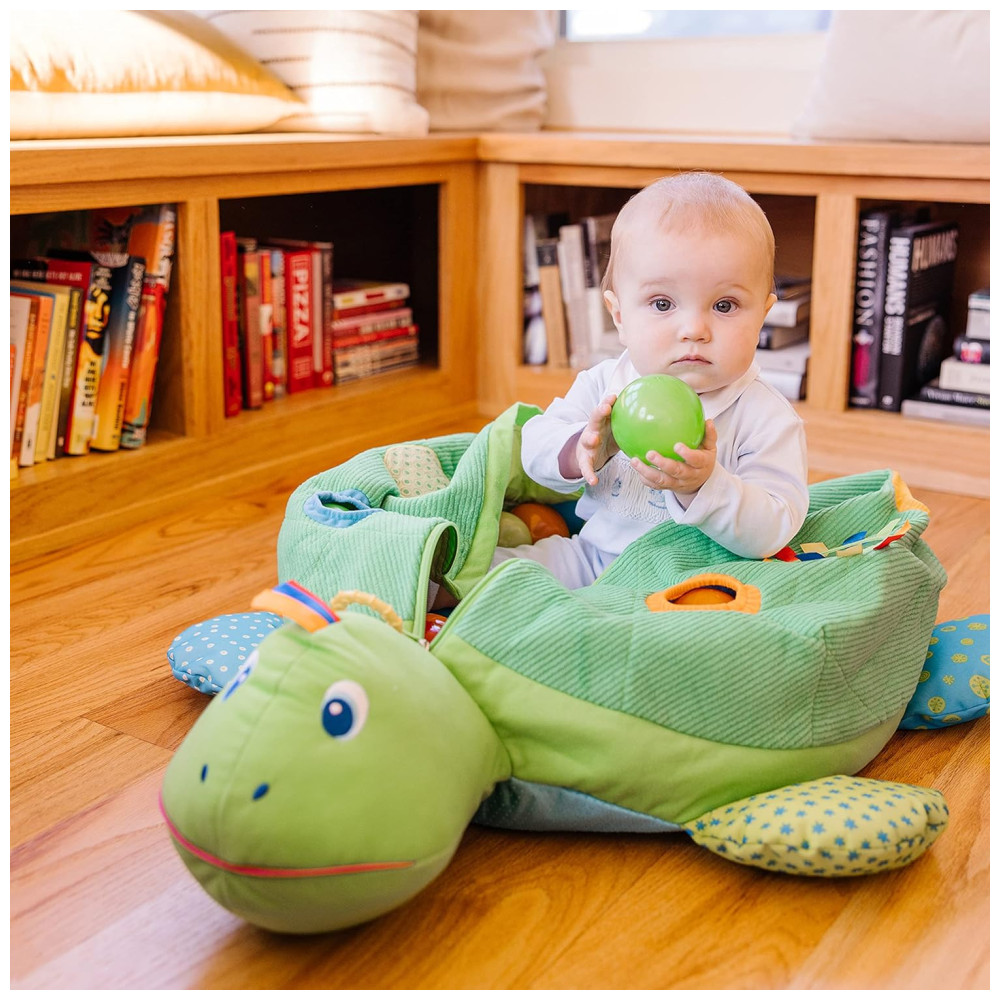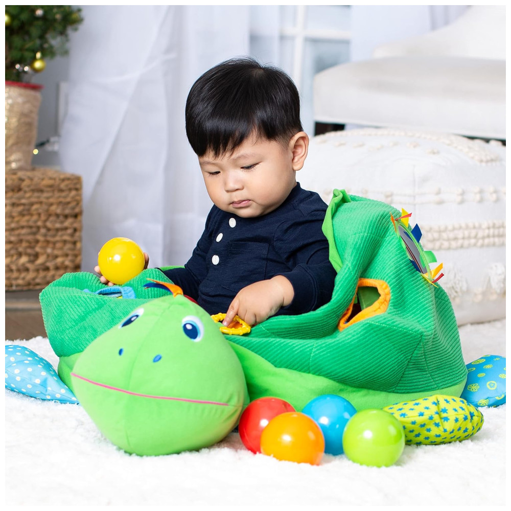 Este brinquedo é uma tartaruga gigante e amigável, com 60 bolas multicoloridas que podem ser apertadas, fáceis de agarrar, jogar e rolar. Possui zíper e abas autoadesivas que podem ser abertas para que o bebê possa sentar se dentro e fechadas para guardar as bolas e fazer um travesseiro divertido. Os recursos incluem orifícios para empurrar e puxar as bolas, fundo antiderrapante, pés enrugados, botão que range, anel texturizado, espelho, etiquetas de tecido sedoso e chocalho de bola macio anexado.