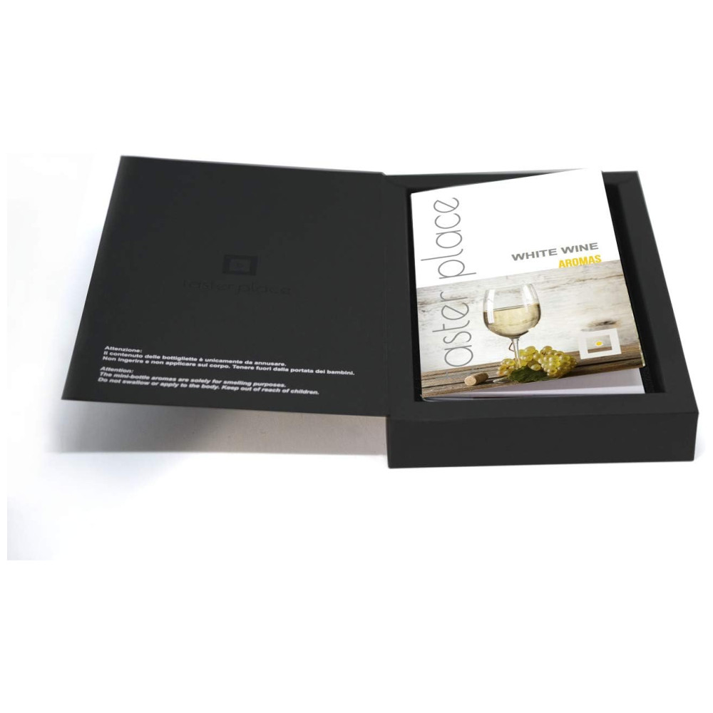 O produto inclui 12 aromas para cheirar que são comumente encontrados em Vinhos Brancos e uma publicação em inglês sobre como treinar o olfato e como degustar Vinho Branco.