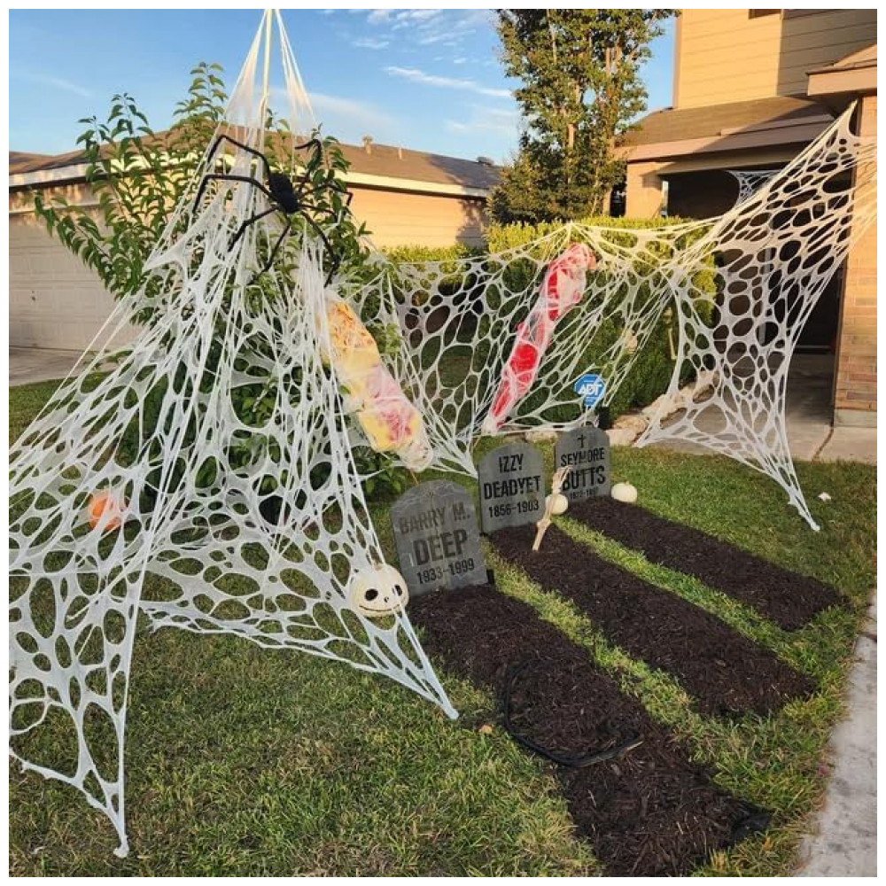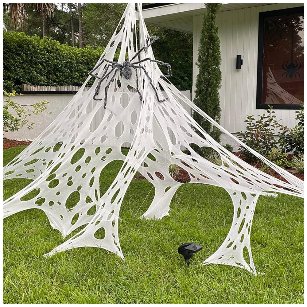 Decorações gigantes da Web da aranha: A teia de aranha vem em forma de tubo, com aproximadamente 4,11 metros de comprimento e 1 metro de largura antes de cortar em pedaços menores. Aranha elástica o mais apertada possível para dar o melhor resultado.