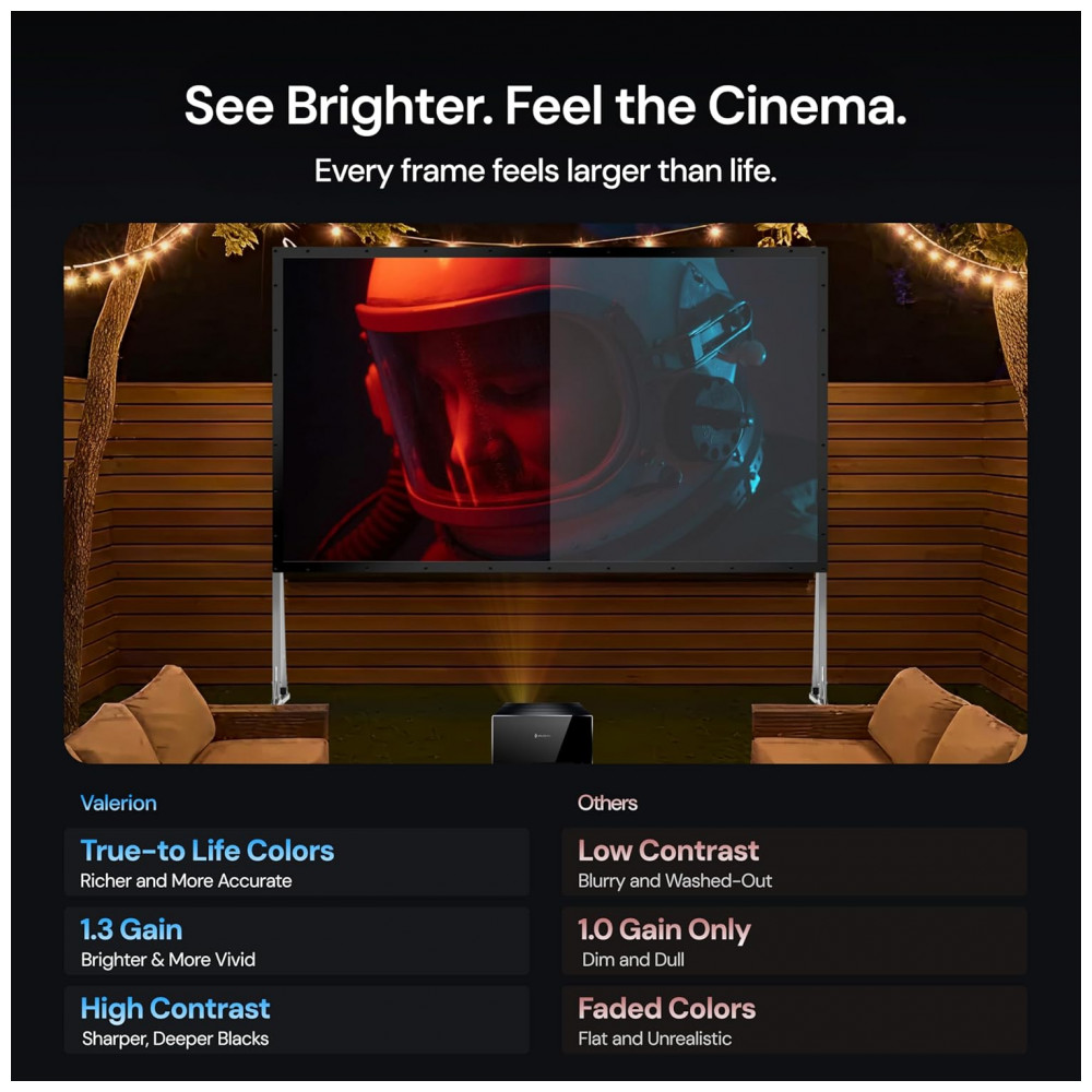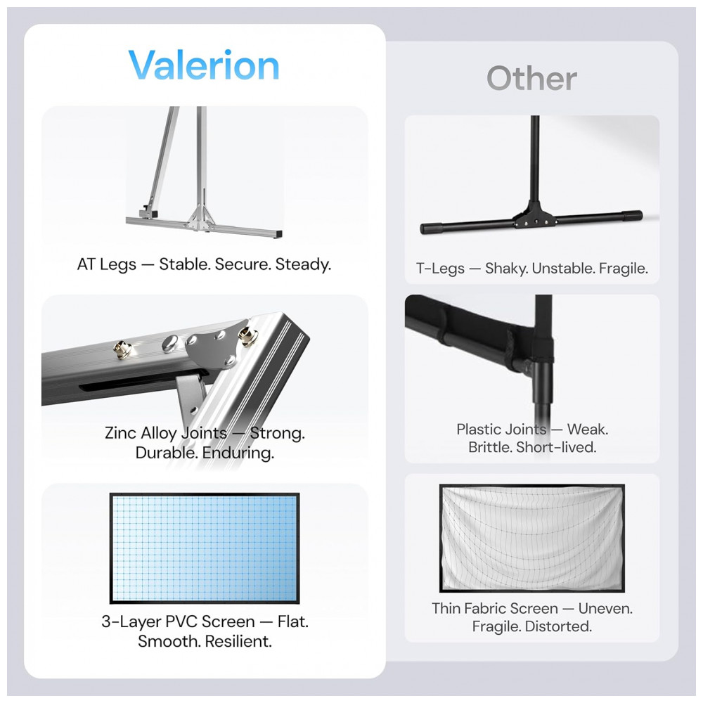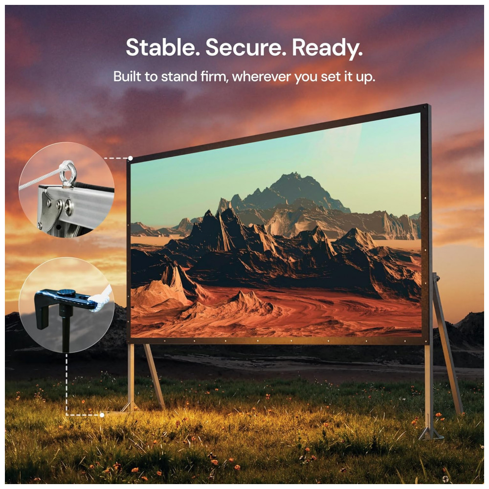 A tela de projeção externa Valerion de 180″ com suporte é uma solução portátil de grande formato para uso em quintais, camping, eventos e home theater, bem como em ambientes internos amplos. A armação em liga de alumínio dobrável e a tela em vinil branco fosco com ganho de 1,3 são otimizadas para conteúdos em alta resolução, proporcionando boa luminosidade, contraste e fidelidade de cores em projeções de grande tamanho.