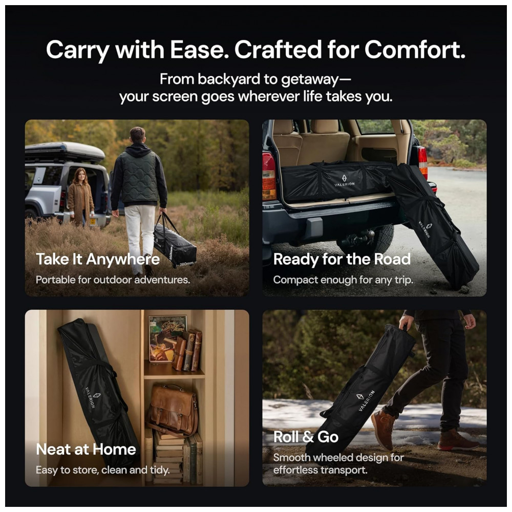 Tela de projeção 180″ Valerion portátil com suporte vinil branco fosco 13 de ganho bolsa com rodinhas