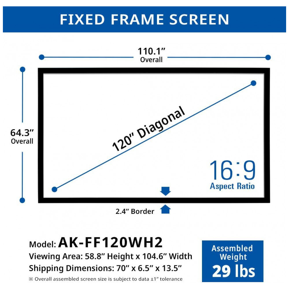 A tela de projeção fixa de 120″ da AKIA SCREENS foi projetada para instalação permanente em parede, com formato 16:9 e área de imagem ampla para salas de home theater e ambientes de projeção dedicados. A superfície de projeção utiliza o material CineWhite UHD-B, com ganho de 1,3 e difusão uniforme, oferecendo brilho consistente, bom nível de contraste e reprodução de cores adequada para conteúdos em alta definição, 4K e 8K.