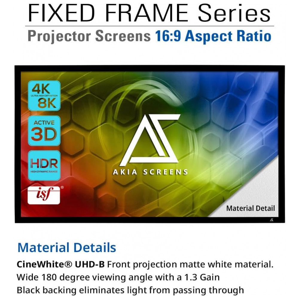 Tela de projeção fixa 120″ AKIA SCREENS branca 16:9 CineWhite UHD-B para home theater de parede