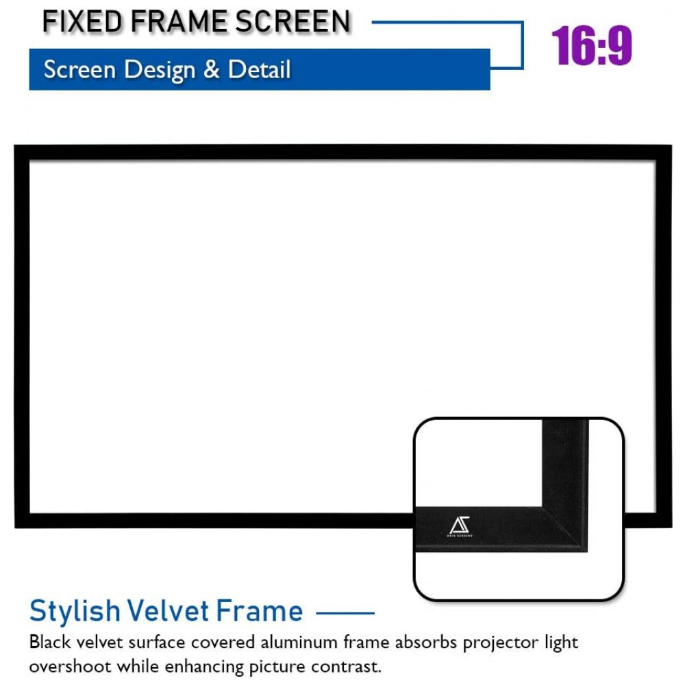 A moldura é construída em alumínio leve, revestida em veludo preto, o que ajuda a absorver o overscan do projetor e melhora a percepção de contraste nas bordas da imagem. O sistema de hastes e molas tensiona o tecido de projeção, mantendo a tela plana em toda a área útil e reduzindo ondulações durante o uso.