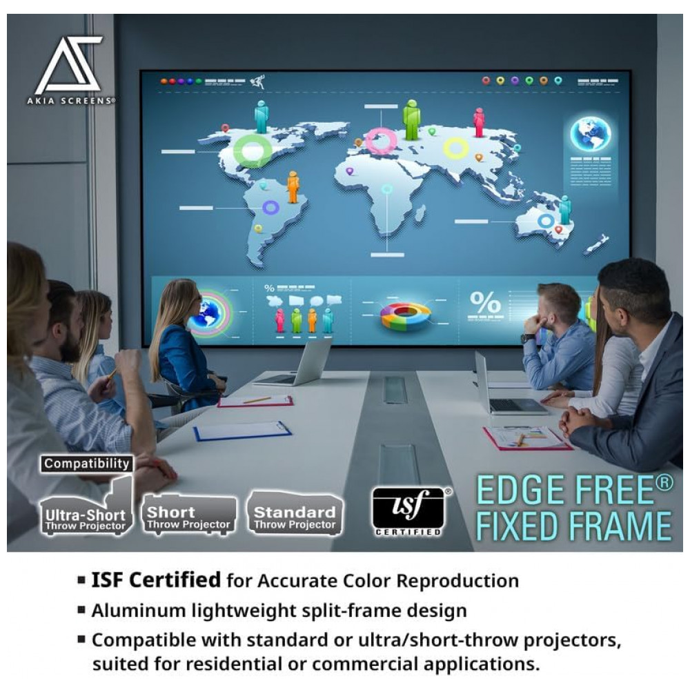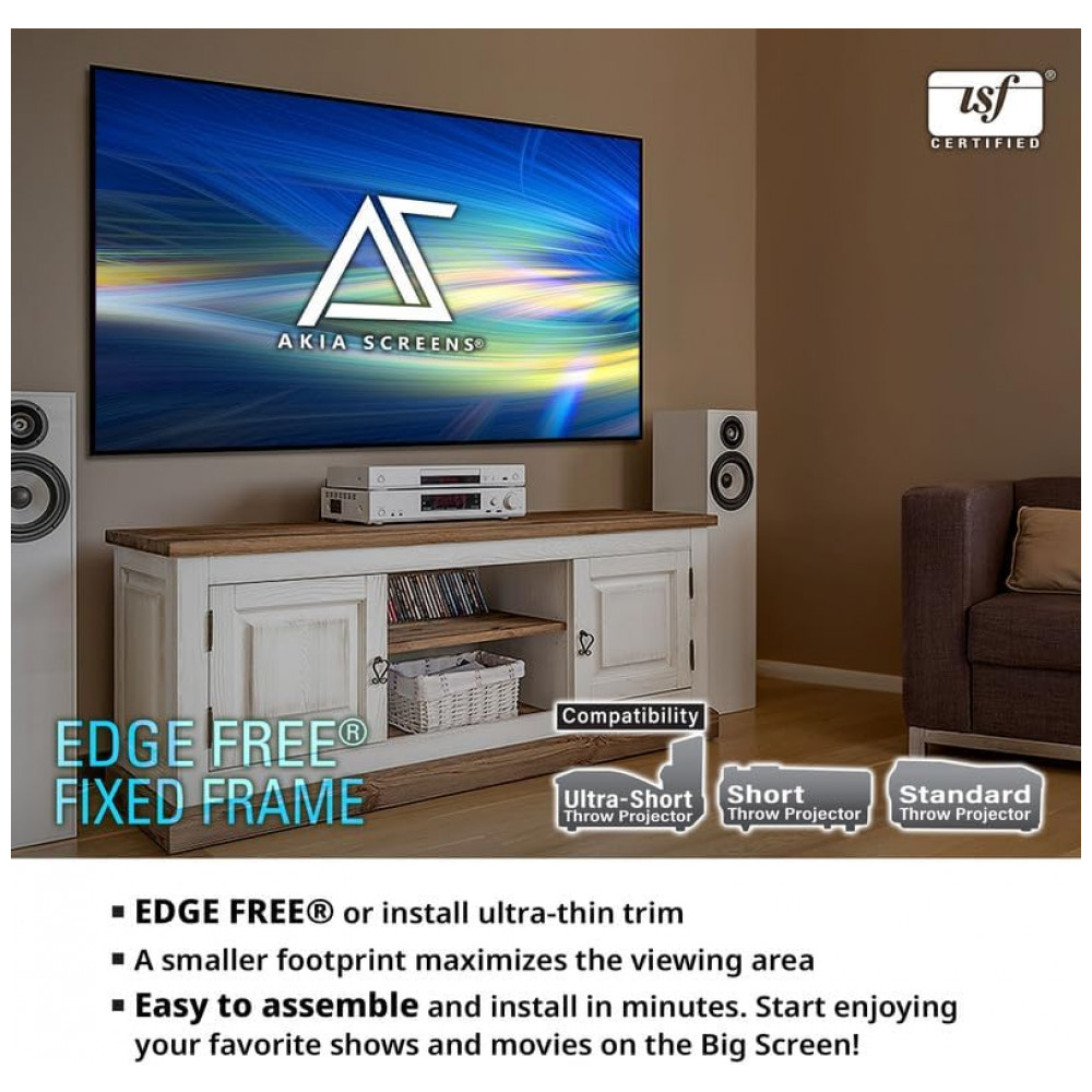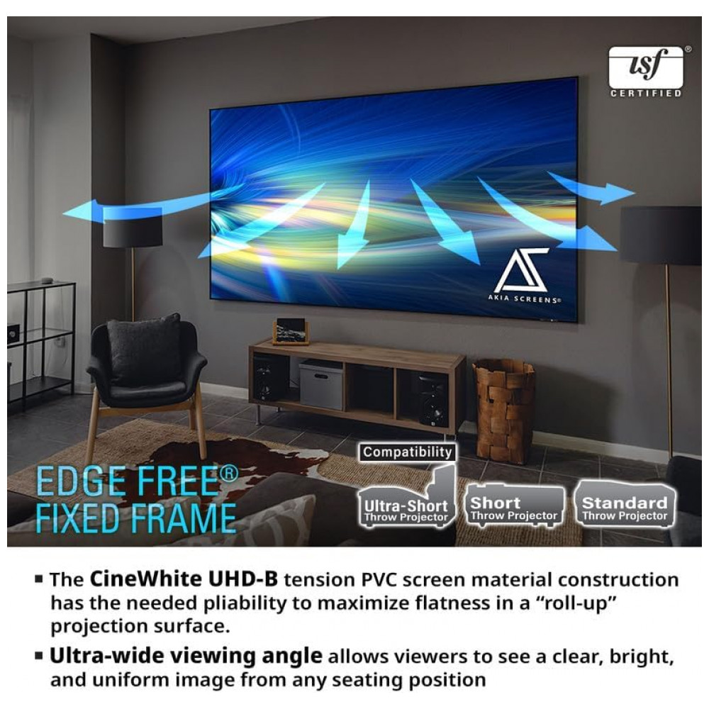 A tela de projeção fixa Akia Screens de 125 polegadas foi desenvolvida para uso em home theater, com formato 16:9 e design edge free que oferece aparência semelhante a uma TV de tela plana instalada na parede. A área de visão é de 2,77 m de largura por 1,56 m de altura, adequada para salas dedicadas de cinema residencial e ambientes internos de entretenimento.