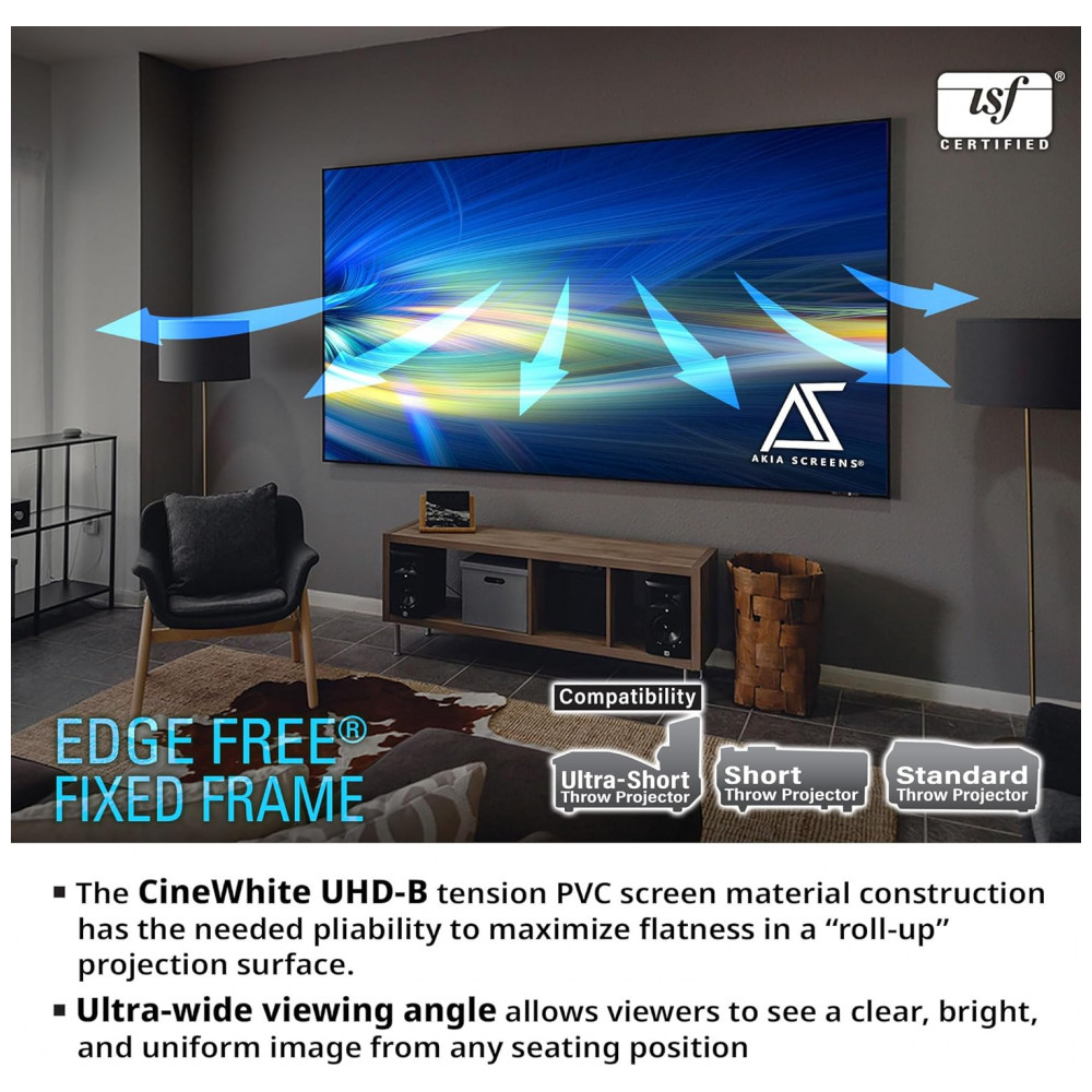 Tela de projeção fixa 145″ Akia Screens branca 16:9 CineWhite UHD-B 13 gain 8K 4K 3D para parede
