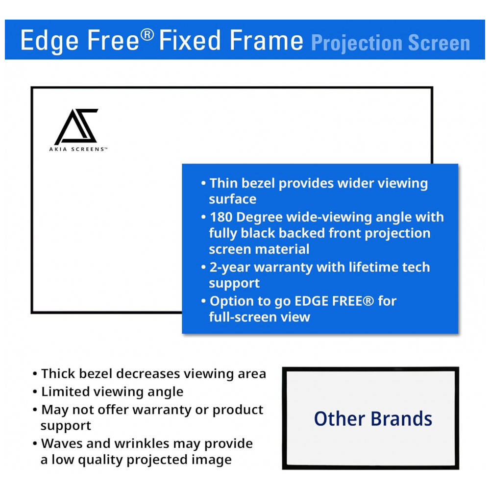 A tela de projeção fixa Akia Screens de 145 polegadas é indicada para home theater de grande porte, com formato 16:9 e design edge free que cria aparência semelhante a uma TV de tela plana de grande diagonal instalada na parede. A área de visão de aproximadamente 3,21 m de largura por 1,80 m de altura oferece uma superfície ampla para filmes, séries, esportes e jogos em alta resolução em ambientes internos com controle de iluminação.
