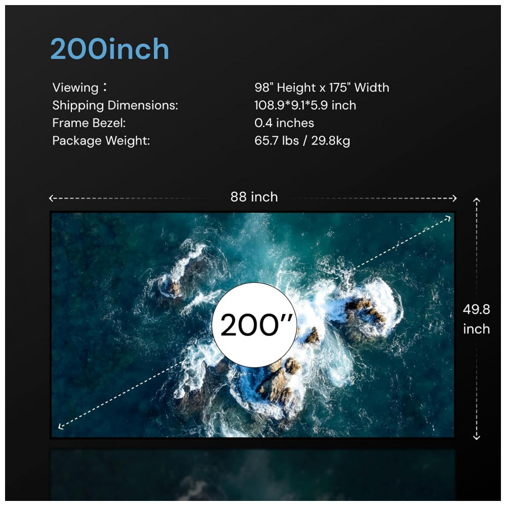Conteúdo da embalagem: 1 tela de projeção fixa 200″, conjunto de molduras, ferragens de montagem e manual do usuário em inglês