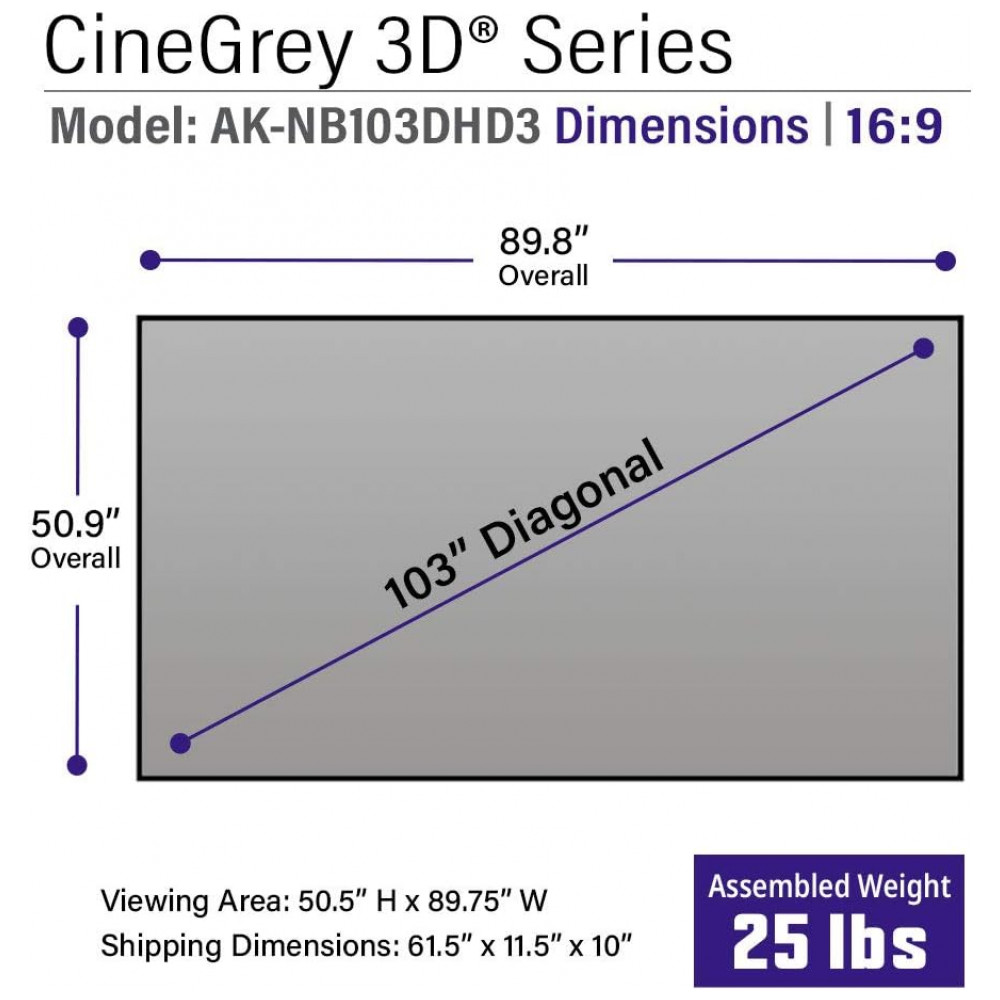 A tela de projeção fixa ALR de 103 polegadas da Akia Screens com material CineGrey 3D foi desenvolvida para uso com projetores de longo alcance padrão em ambientes internos, oferecendo área de visualização em formato 16:9 adequada para home theater, salas de TV, jogos e apresentações. O material CineGrey 3D é uma superfície de rejeição de luz ambiente que reduz reflexos de teto e iluminação da sala em até 65%, elevando o contraste, os níveis de preto e a saturação de cores em relação a telas brancas convencionais.