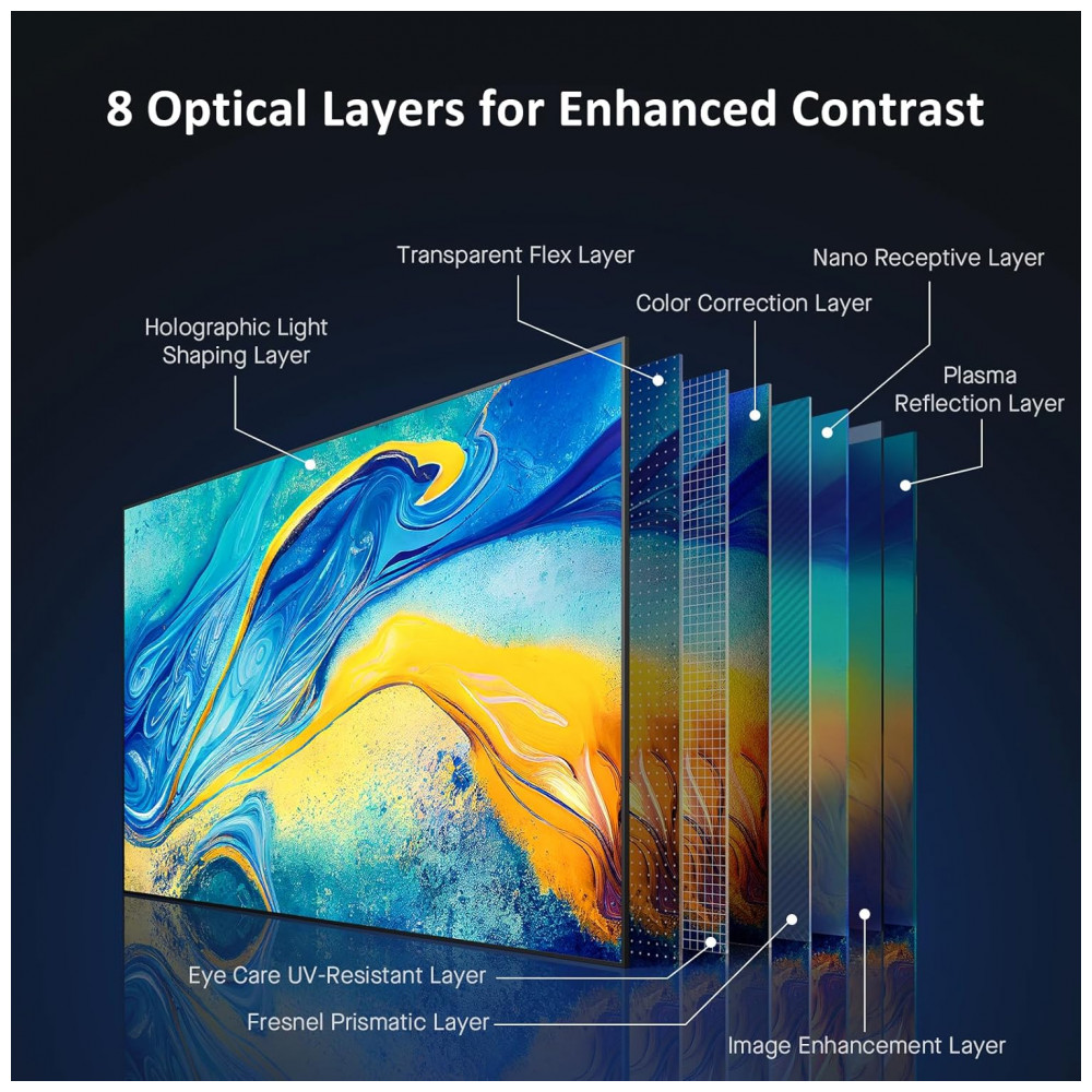A tela de projeção Fresnel de 100 polegadas NexiGo foi desenvolvida para uso com projetores de ultracurta distância em ambientes com luz ambiente, combinando estrutura de moldura fixa e superfície de alto contraste para aplicações residenciais de home theater. Sua construção utiliza material óptico especializado com lente Fresnel em semicírculos concêntricos, que direciona a luz proveniente do projetor em direção à área de visualização, reduzindo reflexos indesejados e melhorando a uniformidade da imagem.