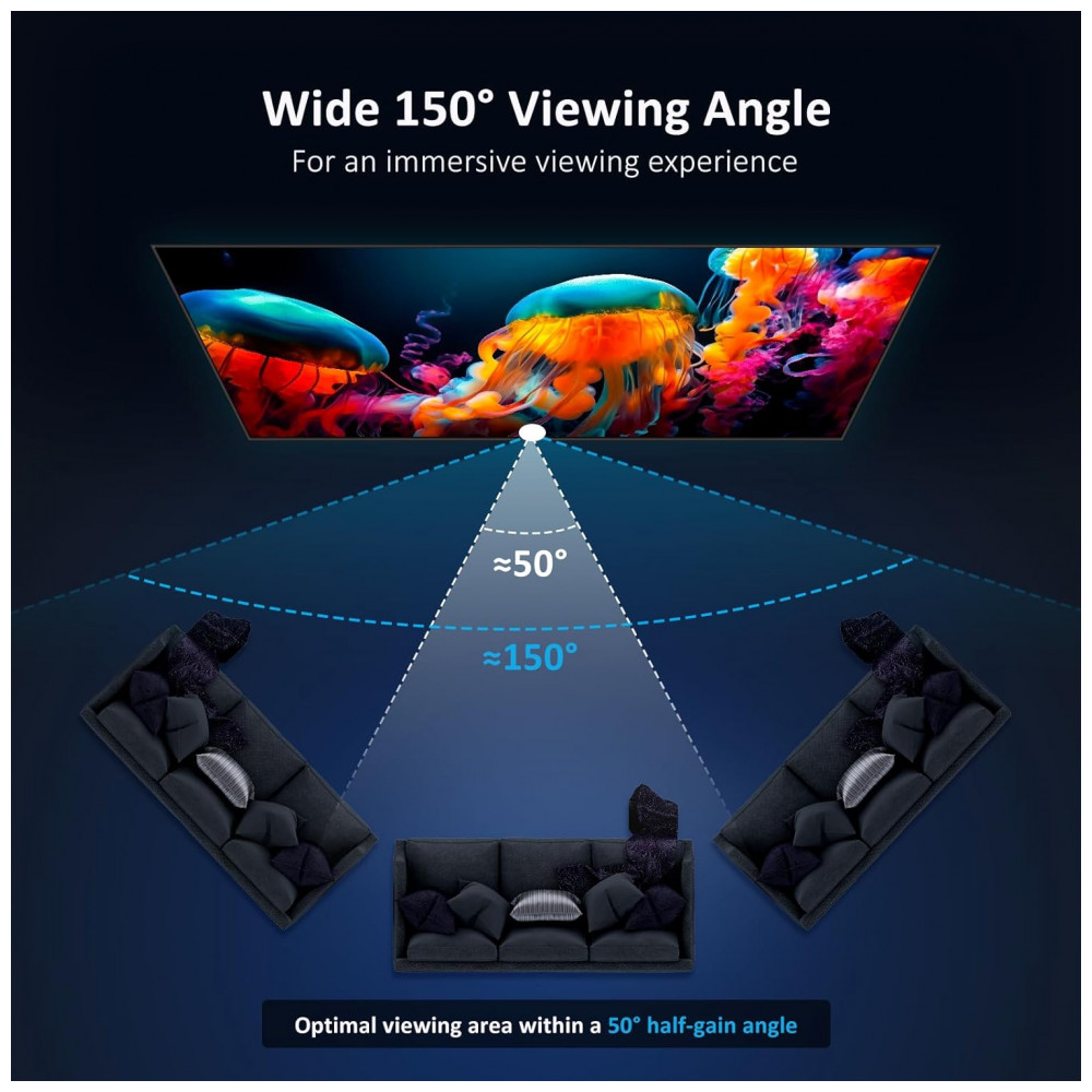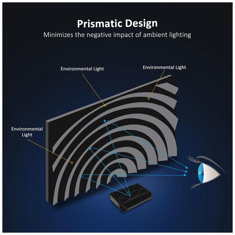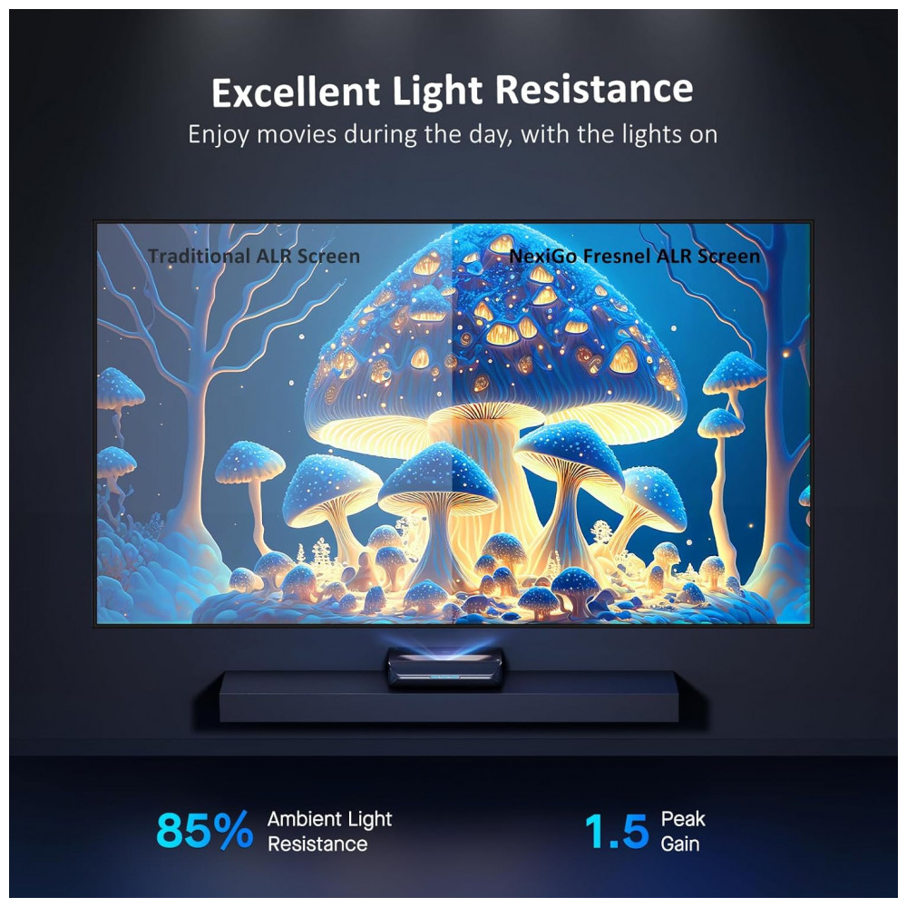 A tecnologia de rejeição de luz ambiente (ALR) com taxa de 85% contribui para manter boa legibilidade da imagem em salas com luminosidade média, atenuando a incidência de luz do teto e do ambiente sobre a superfície de projeção. O ganho de tela de 1,5 favorece a reprodução de cores vivas e maior nível de contraste em comparação com telas brancas foscas padrão, mantendo a fidelidade do conteúdo em diferentes tipos de projeção.