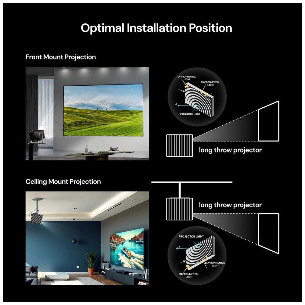 Desenvolvida especificamente para projetores de longa distância, esta tela não é indicada para projetores de foco ultracurto, que exigem configuração óptica própria. É uma opção adequada para sistemas de cinema em casa, salas de TV, ambientes de jogos, salas de reunião e aplicações profissionais que demandam qualidade de imagem elevada em ambientes com controle parcial de iluminação.