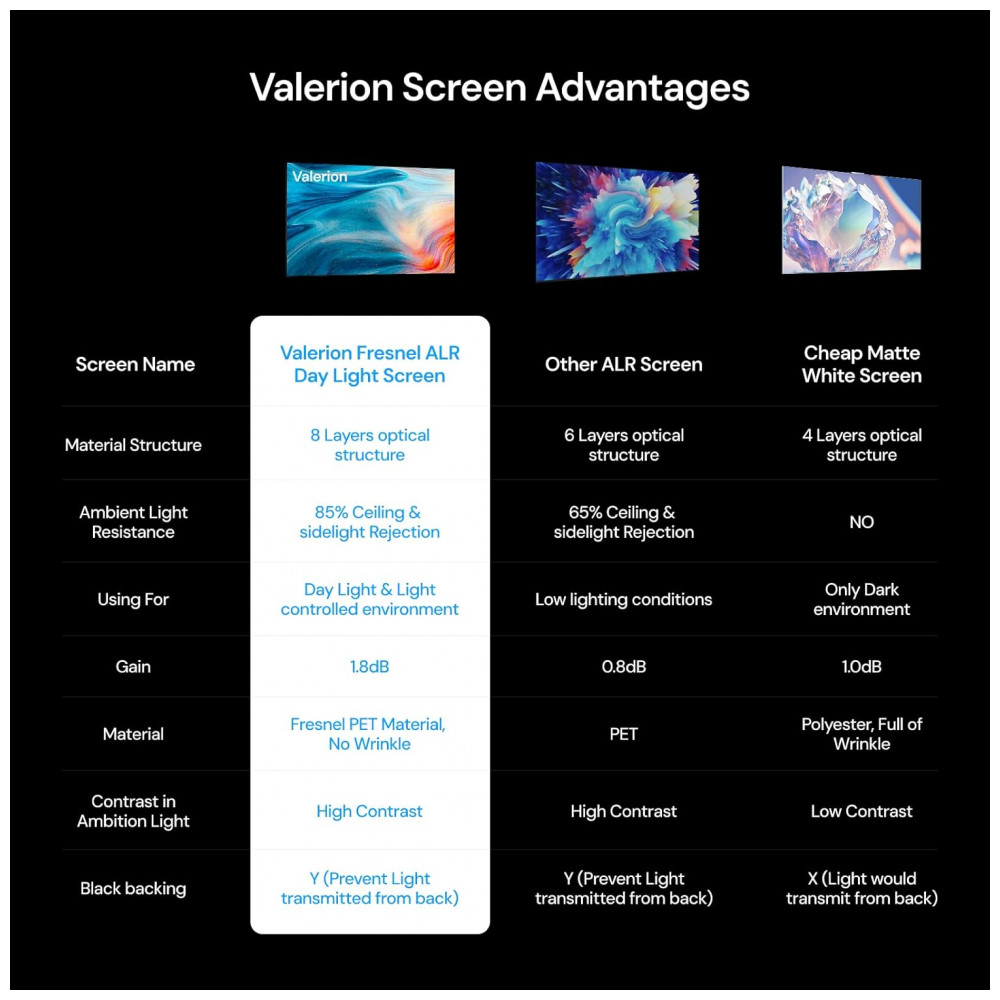A tela de projeção Fresnel ALR de 100″ da Valerion é uma tela de moldura fixa projetada para projetores de longa distância, oferecendo alto desempenho de imagem em ambientes com luz ambiente. Com proporção 16:9, estrutura óptica Fresnel de 8 camadas e ganho de 1,8, a tela direciona o feixe de luz do projetor para a área de visualização e reduz a interferência da iluminação externa, favorecendo maior contraste e definição.