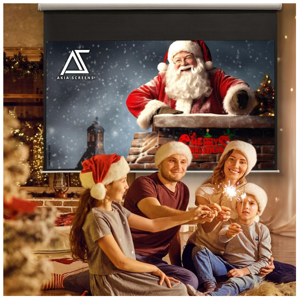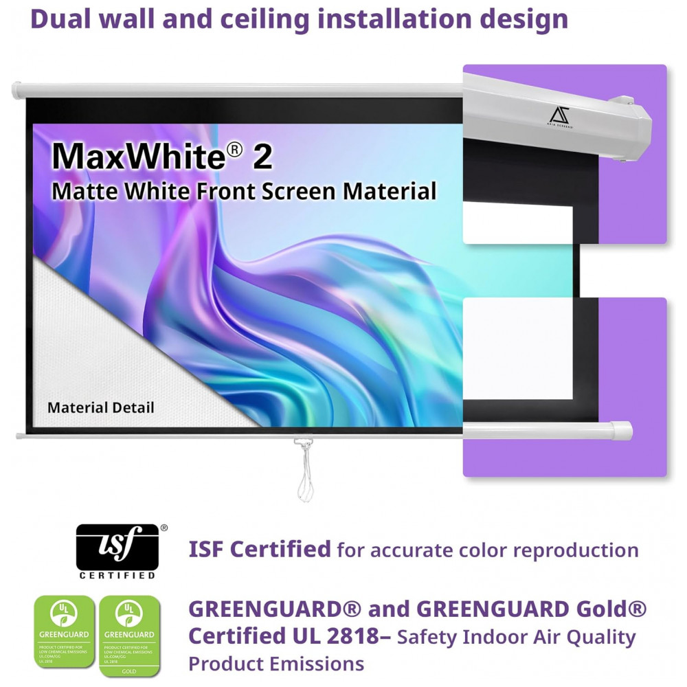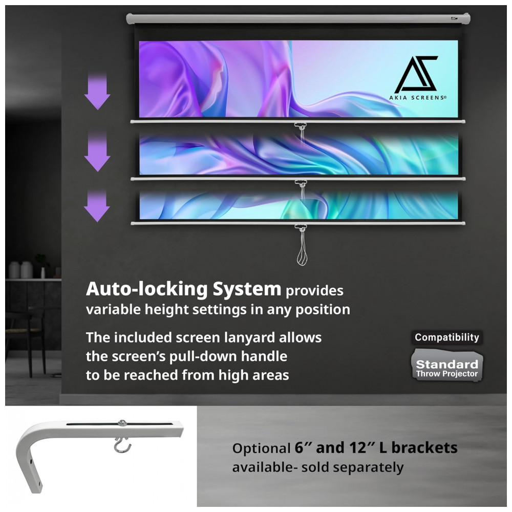 Tela de projeção manual 100″ Akia Screens branca 16:10 MaxWhite 2 4K 8K para teto ou parede