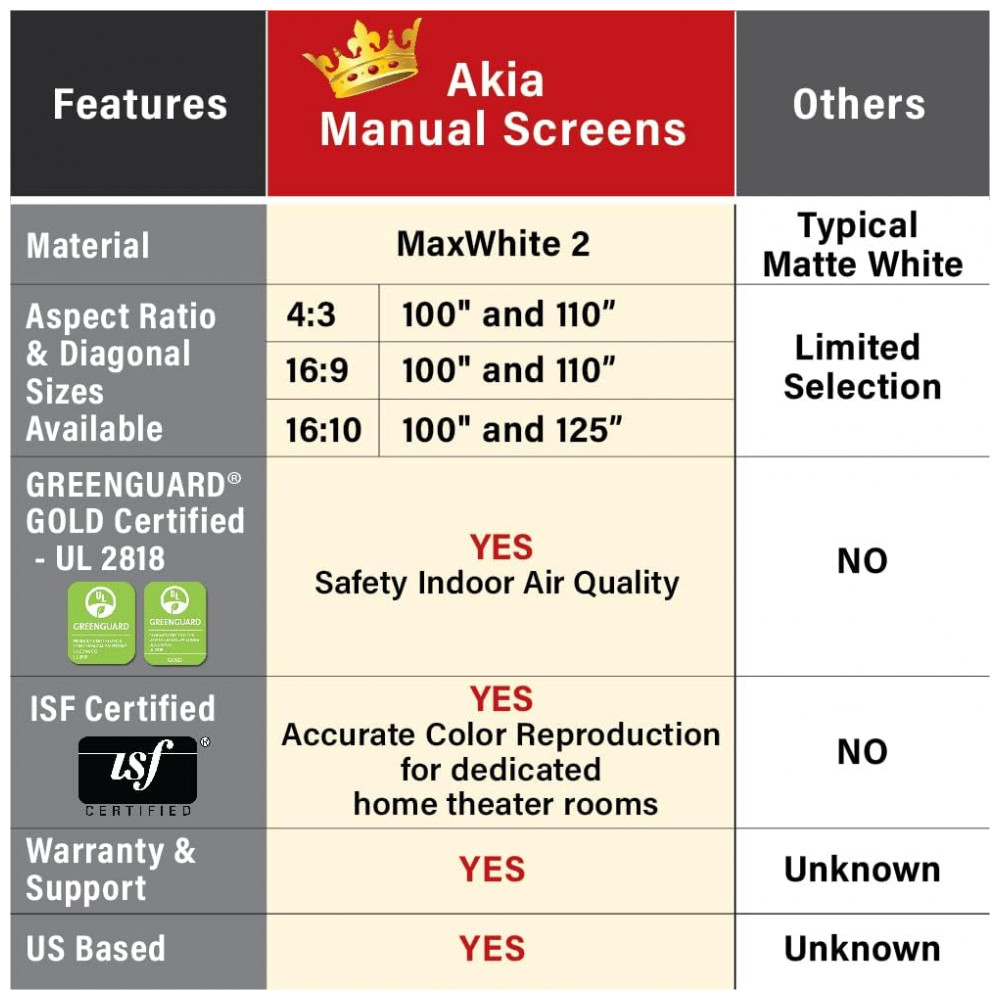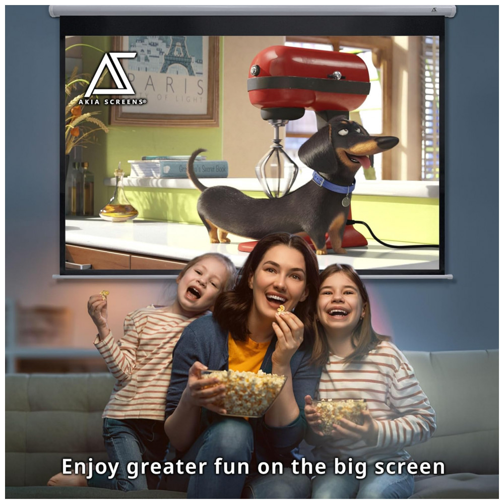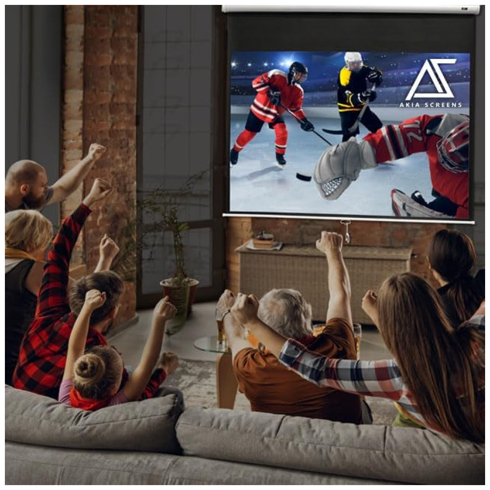 Tela de projeção manual 100″ Akia Screens branca 4:3 MaxWhite 2 4K 8K retrátil para teto ou parede