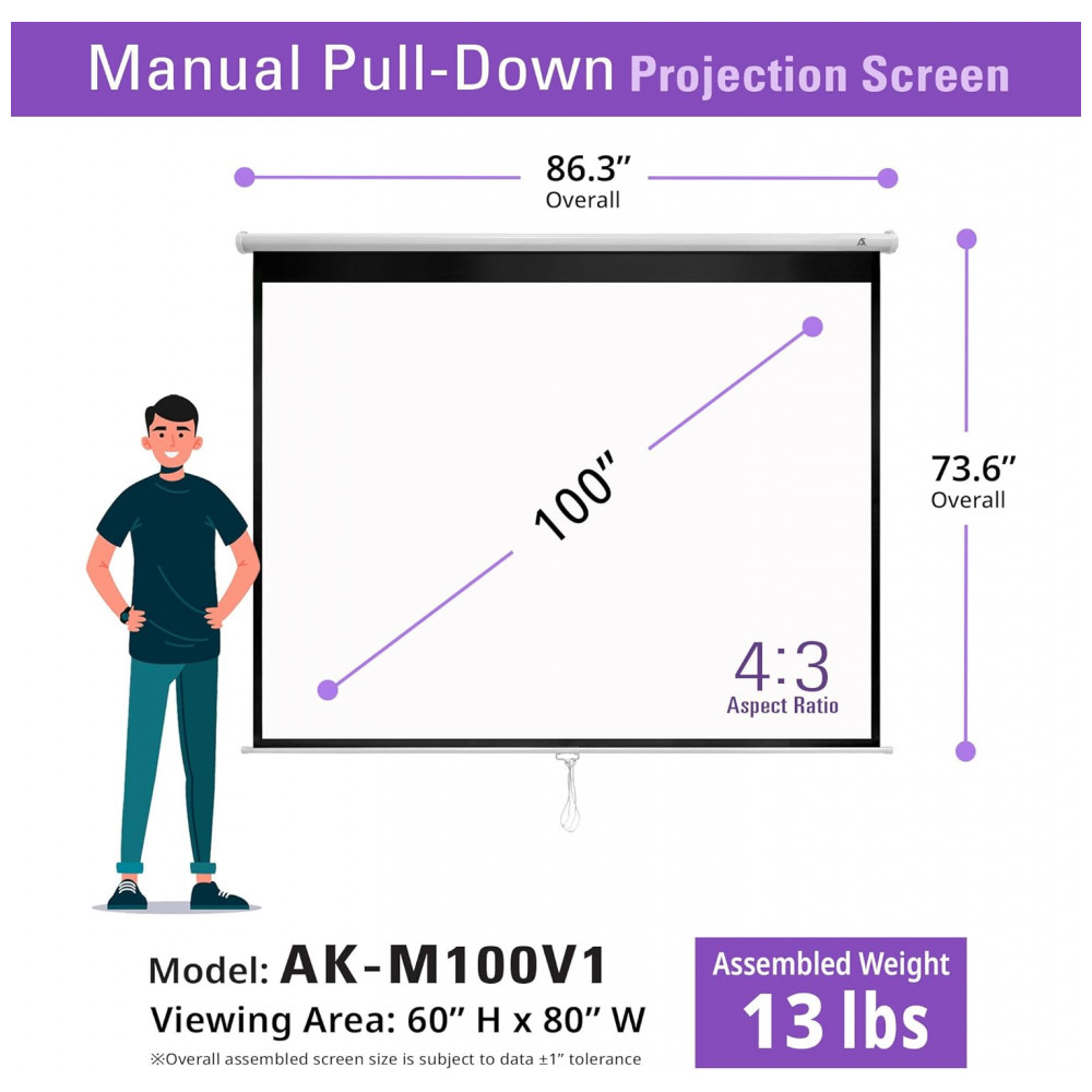 A tela de projeção manual Akia Screens de 100 polegadas é projetada para uso em home theater, salas de aula, escritórios e ambientes de apresentação, oferecendo formato nativo 4:3 com compatibilidade para projeções em 16:9 e 16:10. A área de visão é de 2,03 m de largura por 1,52 m de altura, adequada para conteúdos de vídeo, apresentações e materiais educacionais em ambientes internos.