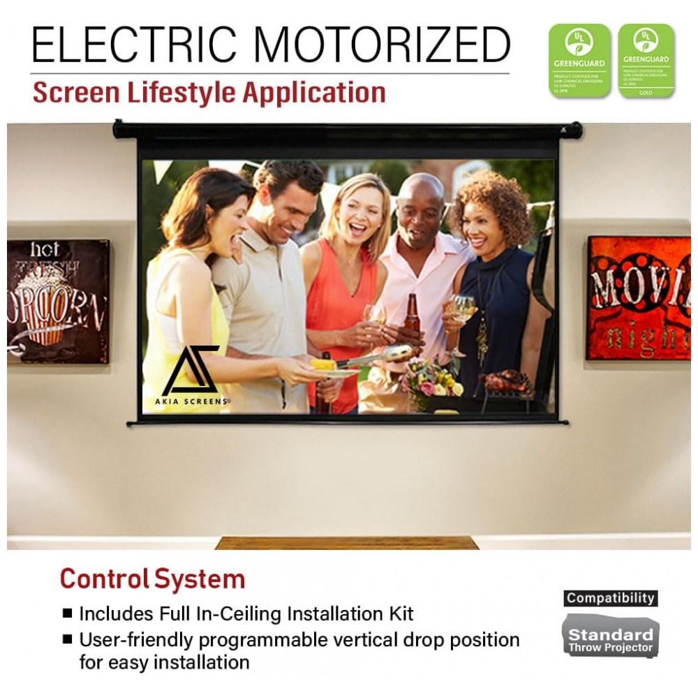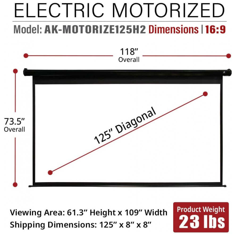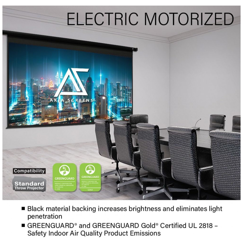 Tela de projeção motorizada 125″ Akia Screens 16:9 MaxWhite 2 carcaça preta controle remoto 110V