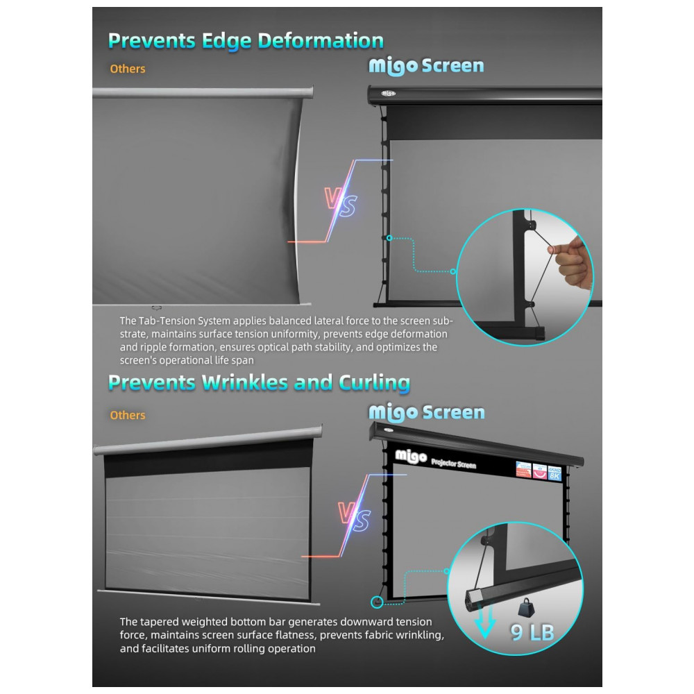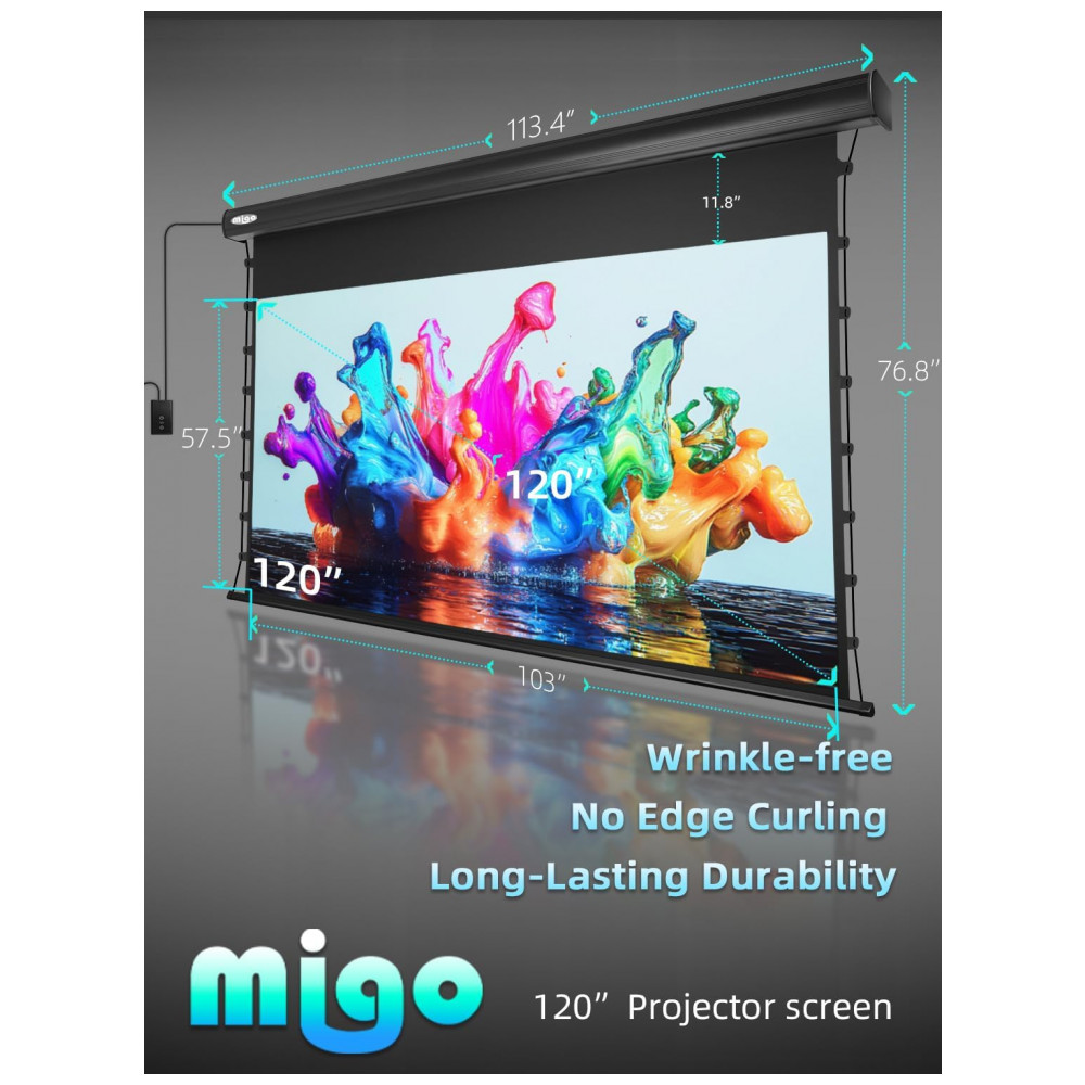 Tela de projeção motorizada 266x149cm MIGO cinza cristal ganho 2.0 tab-tension 16:9 teto e parede 110V