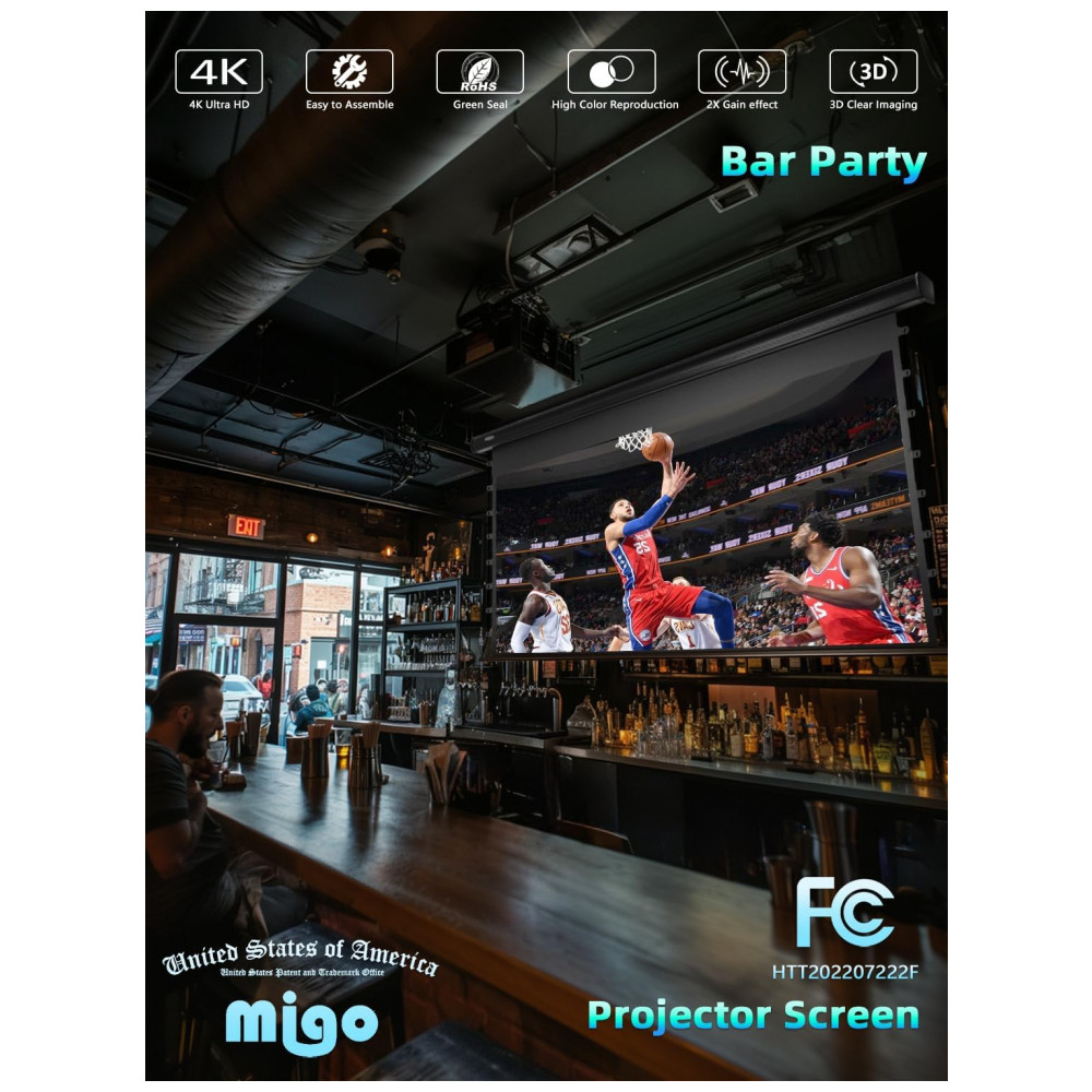 A tela de projeção motorizada MIGO de 120″ com material cinza cristal foi desenvolvida para uso interno em home theater, salas corporativas, bares e ambientes de entretenimento que exigem alto contraste em formato 16:9. A superfície de projeção possui ganho 2,0, favorecendo maior brilho percebido e melhor definição de detalhes em conteúdos em 4K, com ângulo de visão amplo para diferentes posições de assento.