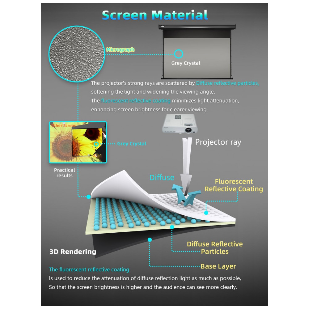 A tela é otimizada para uso com projetores com pelo menos 3000 lúmens, de longo alcance e curto alcance, apresentando desempenho adequado em ambientes com luz ambiente parcial. A superfície cinza cristal auxilia na melhoria do contraste, ajudando a manter legibilidade da imagem sem necessidade de escurecimento total do ambiente dentro das condições recomendadas.