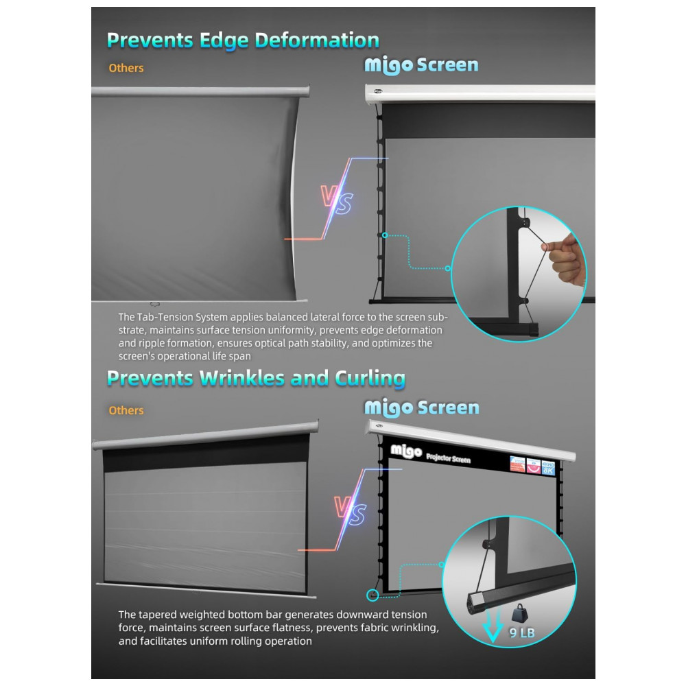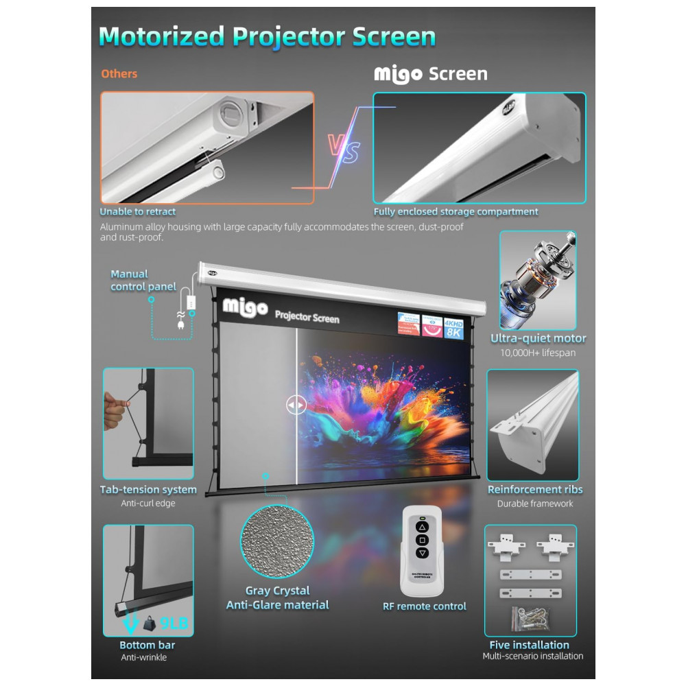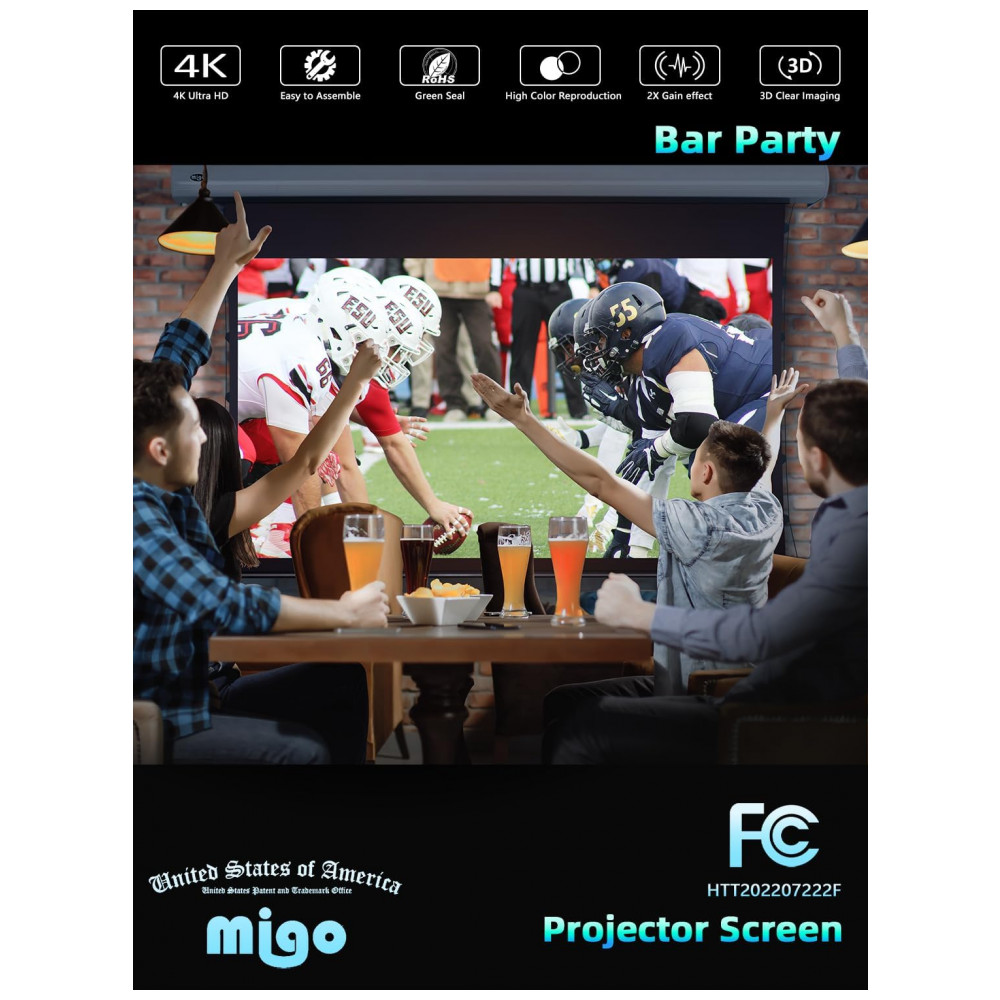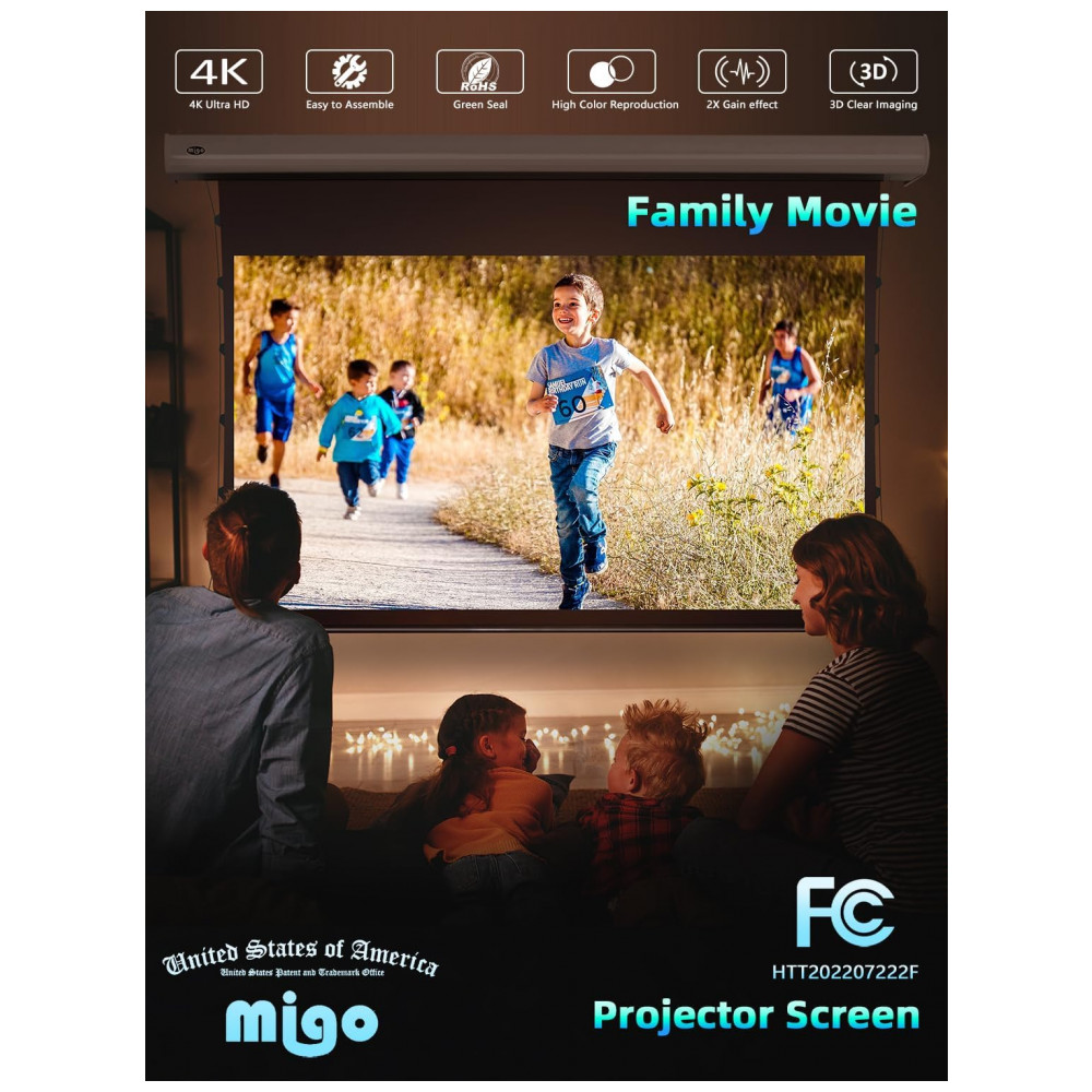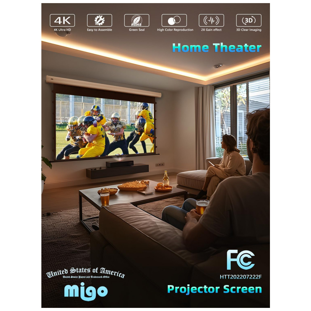 A tela de projeção motorizada MIGO de 120″ com material cinza crystal foi desenvolvida para uso interno em home theater salas corporativas e ambientes de entretenimento que exigem formato 16:9 com alto contraste mesmo com luz ambiente parcial. A superfície de projeção possui ganho 2.0 e ângulo de visão de aproximadamente 175 graus oferecendo imagem brilhante e cores intensas em conteúdos 4K HD quando utilizada com projetores de pelo menos 3000 lúmens.
