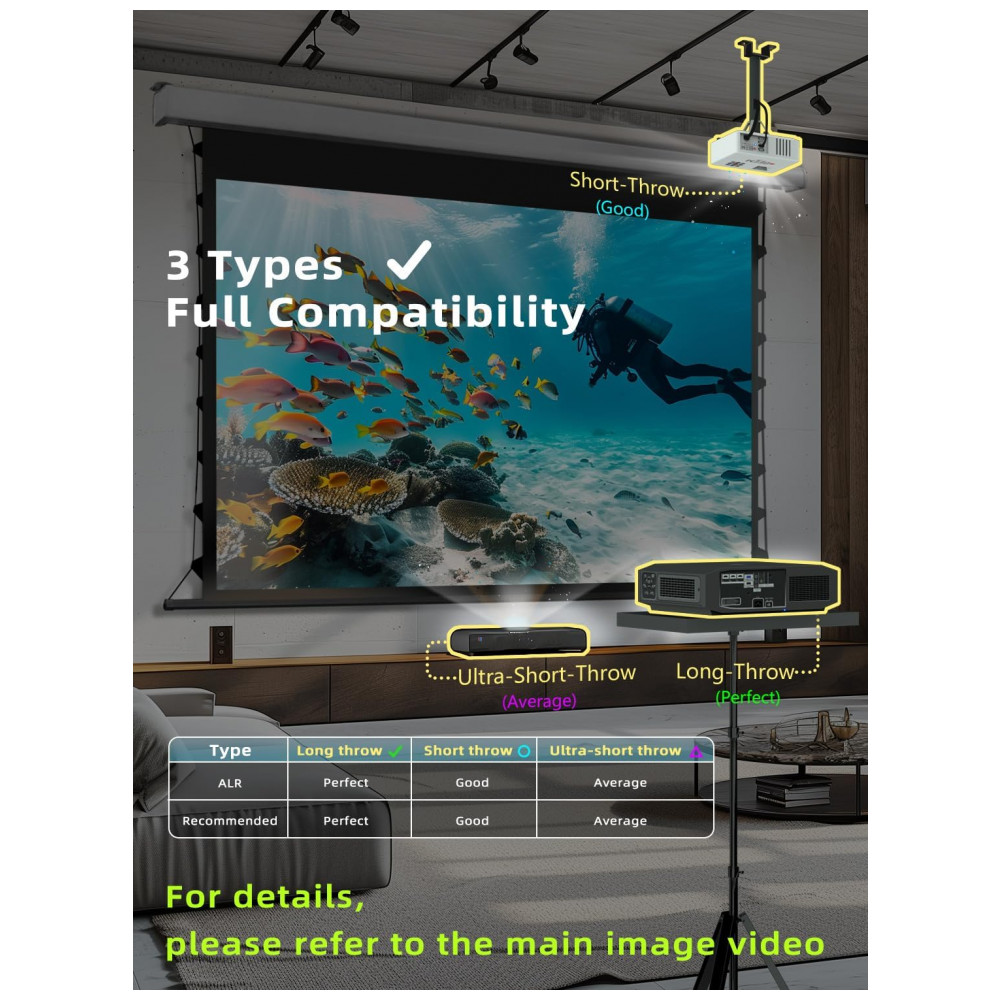 Tipo de projeção compatível: Projetores de longo alcance curto alcance e ultracurto alcance recomendada para long throw