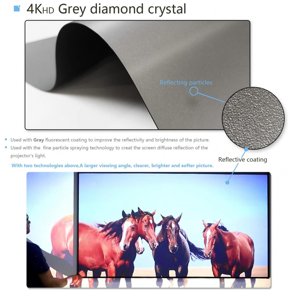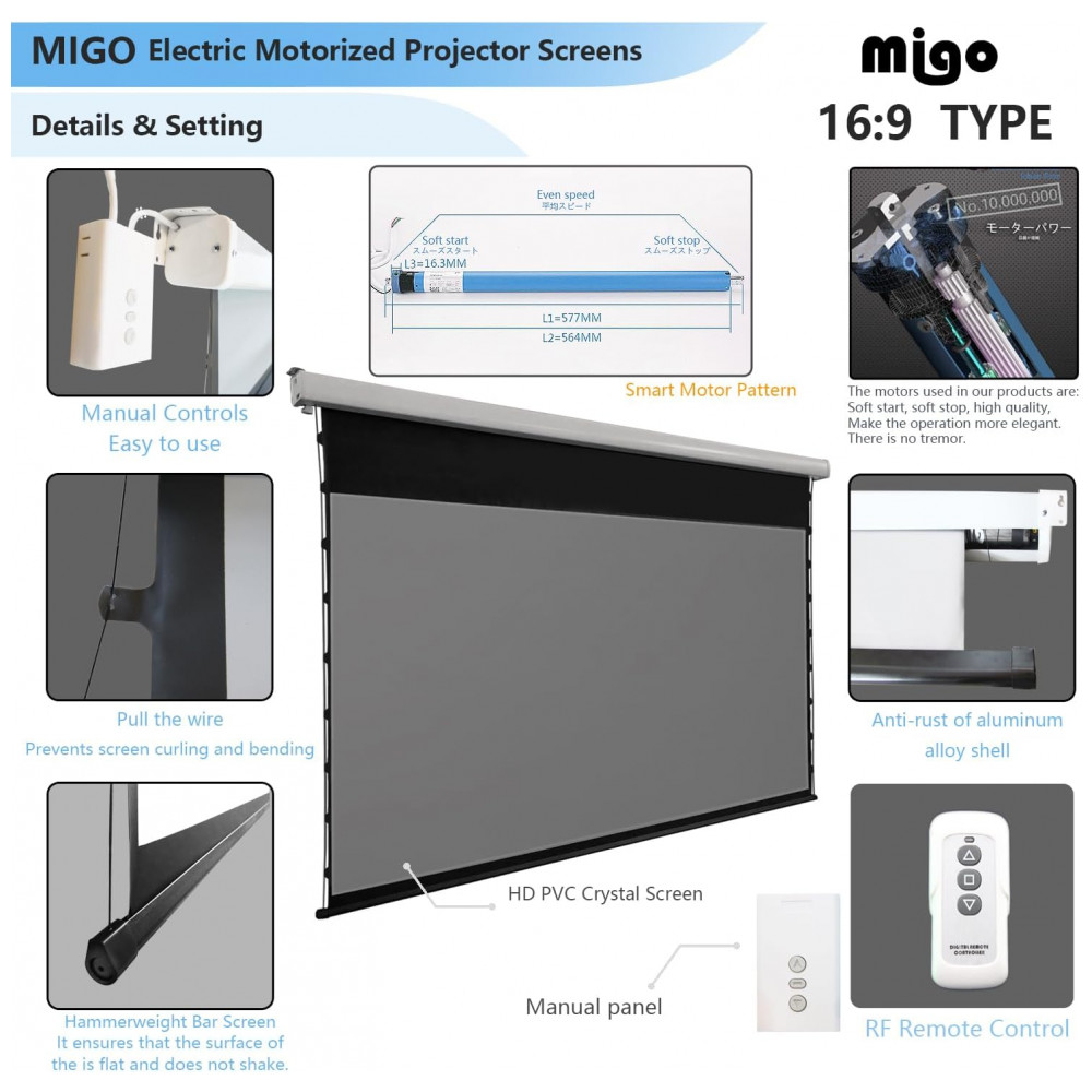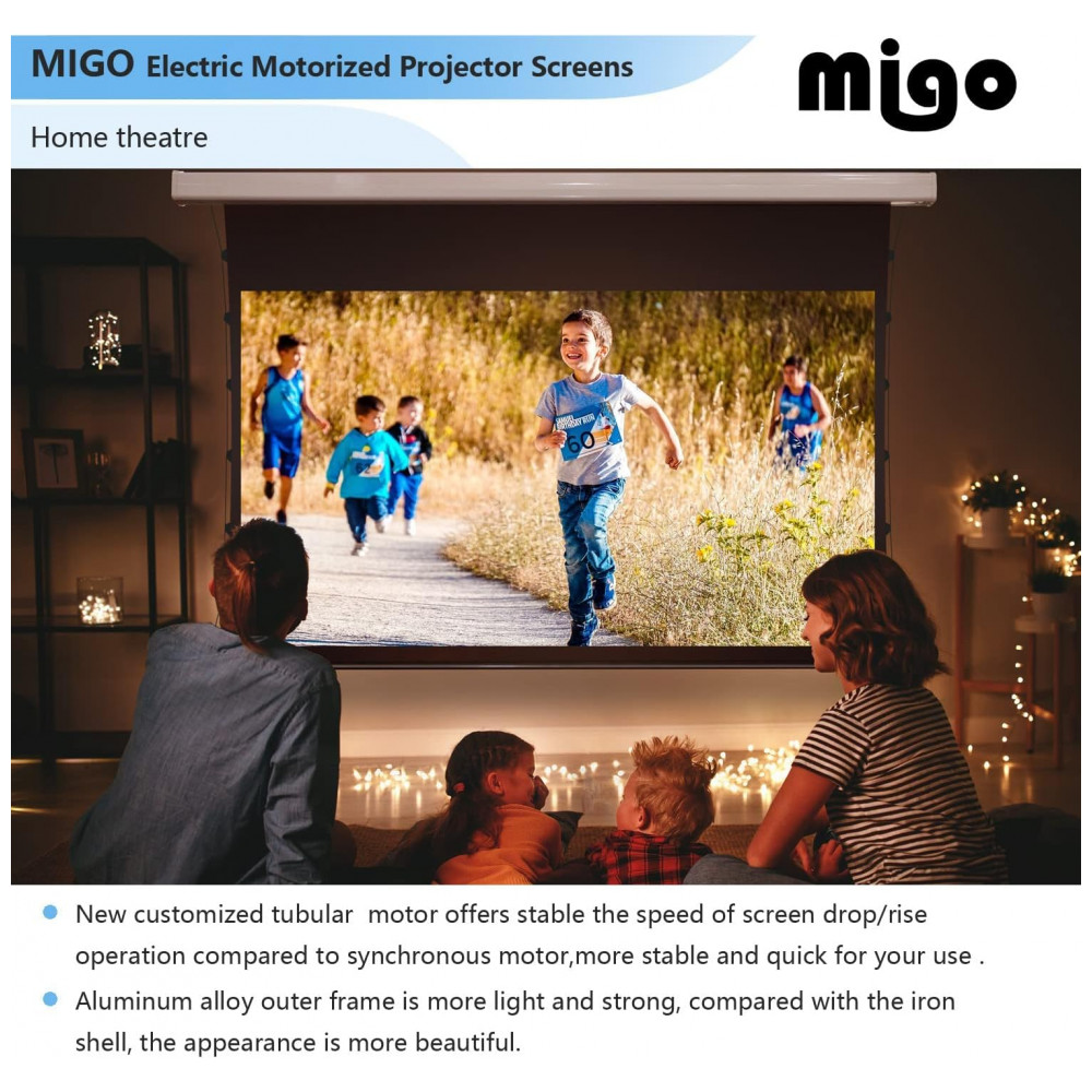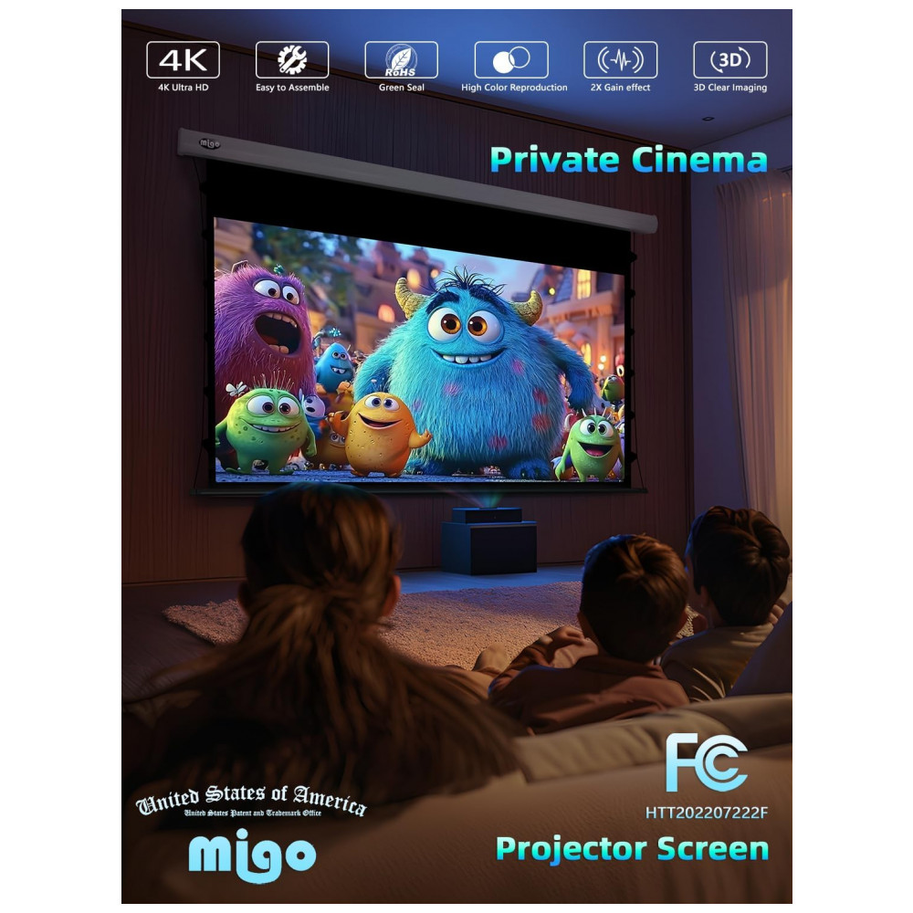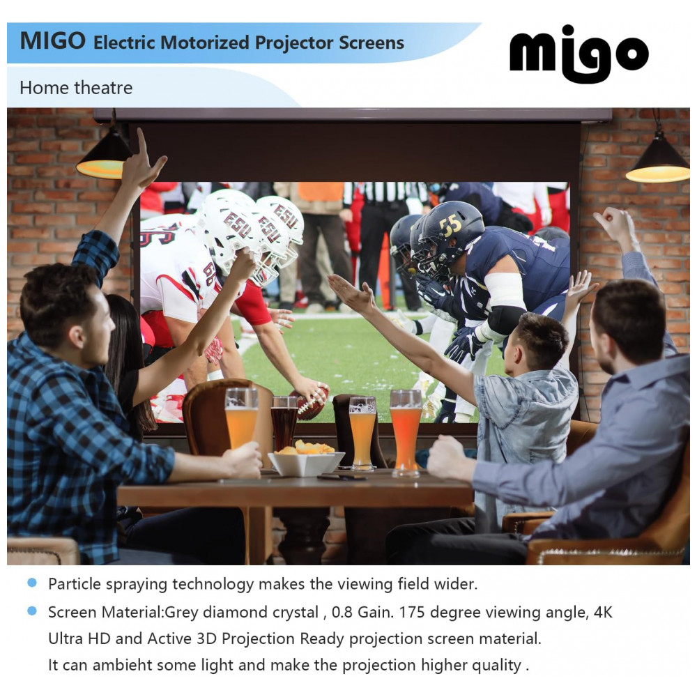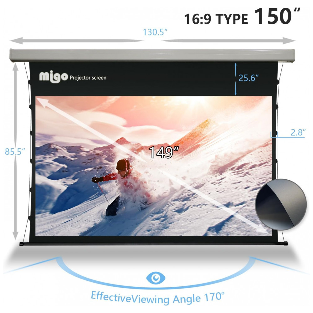 A tela de projeção motorizada MIGO de 150″ com material cinza crystal foi desenvolvida para home theater salas amplas e ambientes corporativos que exigem imagem em grande formato 16:9 com bom contraste em luz ambiente parcial. A superfície cinza crystal com ganho 2.0 e ângulo de visão de aproximadamente 175 graus favorece maior brilho percebido e melhor contraste em conteúdos em alta definição quando utilizada com projetores a partir de 3000 lúmens.