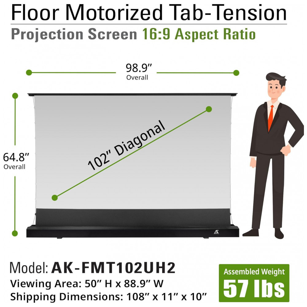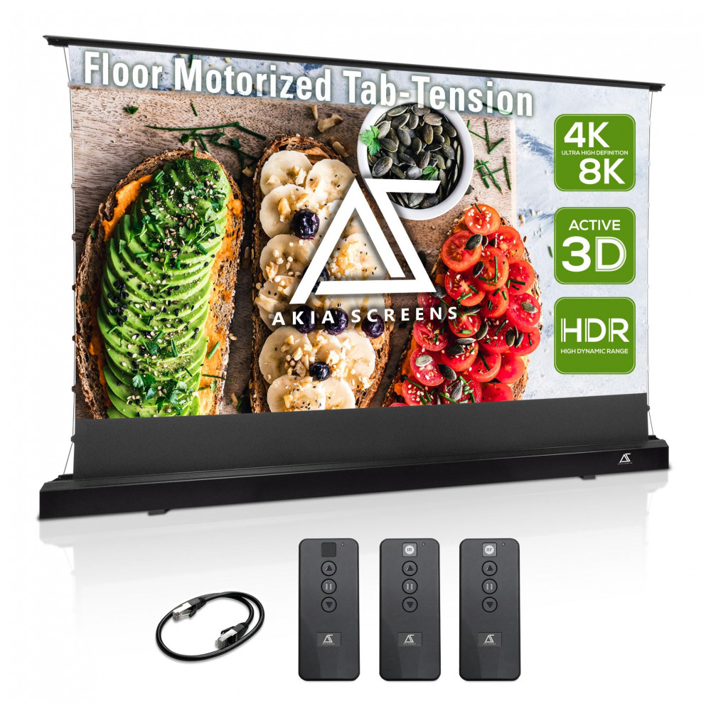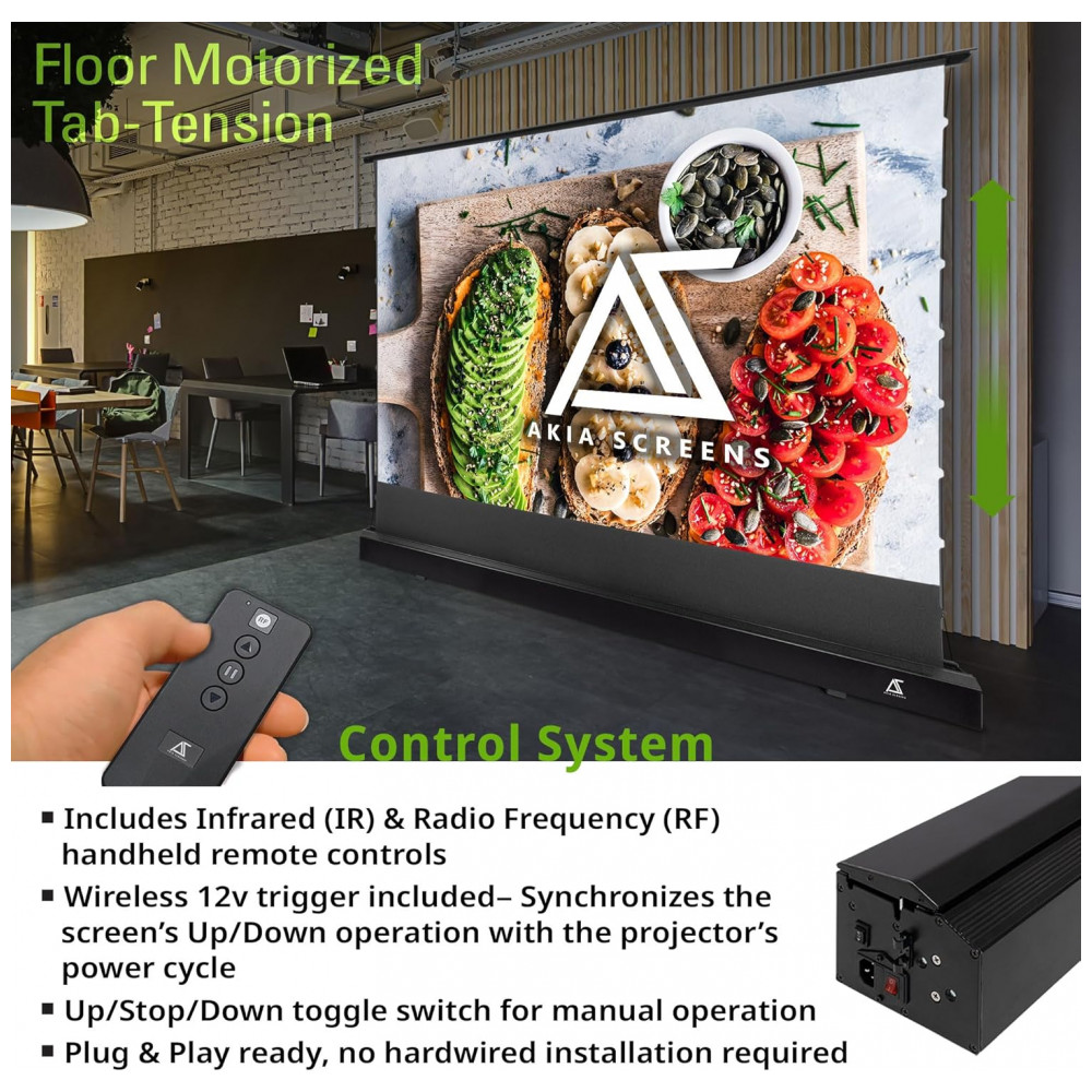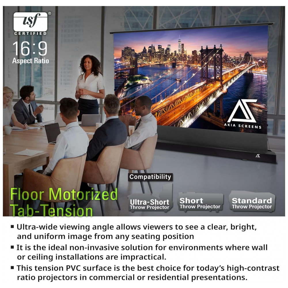 Tela de projeção motorizada piso 102″ 16:9 Akia Screens CineWhite branca tab-tension para projetor UST/short/standard 110V