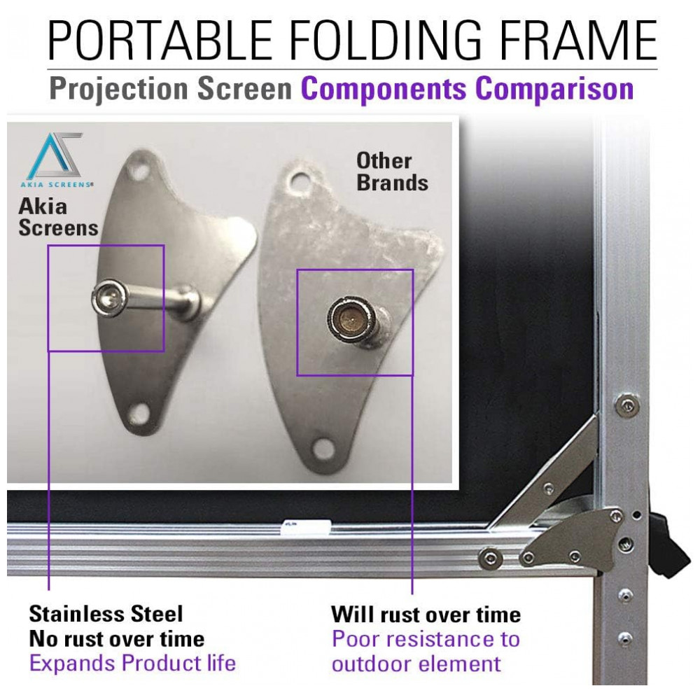 A tela integra a linha de estruturas dobráveis portáteis da AKIA SCREENS, com ajuste de altura para adequação a diferentes ambientes e posicionamento do feixe de projeção. A combinação de quadro em alumínio, pés em T e superfície de projeção frontal com parte traseira escura contribui para estabilidade mecânica e controle de luminosidade ambiente.
