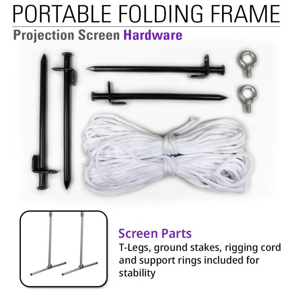 Conteúdo da embalagem: Tela de projeção, estrutura em alumínio, pés em T, bolsa de transporte, estacas de solo, cordas de fixação e suportes de reforço