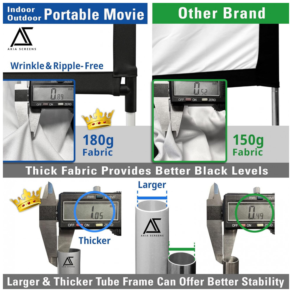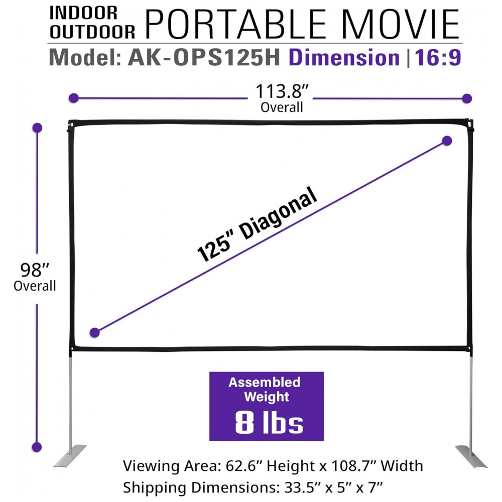 A tela de projeção portátil de 125″ da AKIA SCREENS é indicada para uso interno e externo em sessões de cinema, eventos, apresentações e entretenimento em família, combinando formato widescreen 16:9 com estrutura autoportante leve e de montagem rápida. O conjunto utiliza tecido SilkWhite 2 com compatibilidade para projeção frontal e traseira e estrutura em tubos de alumínio, adequada para montagem em quintais, salões, áreas comuns e passeios.