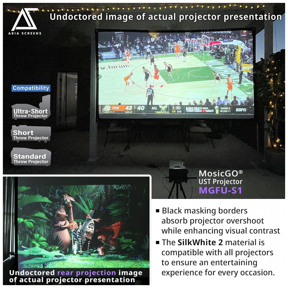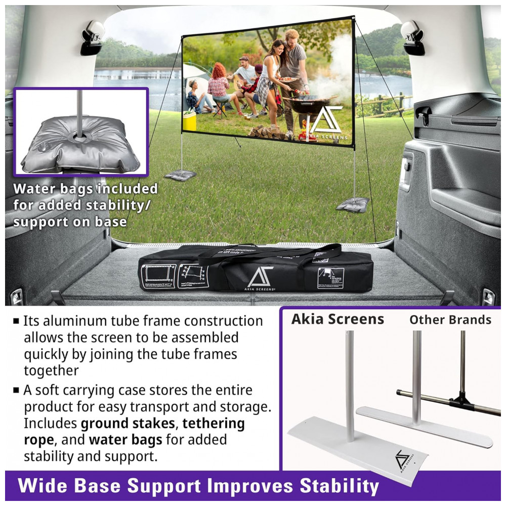 Tela de projeção portátil 125″ 16:9 AKIA SCREENS SilkWhite 2 frente e verso com estrutura dobrável para uso interno e externo