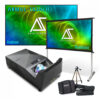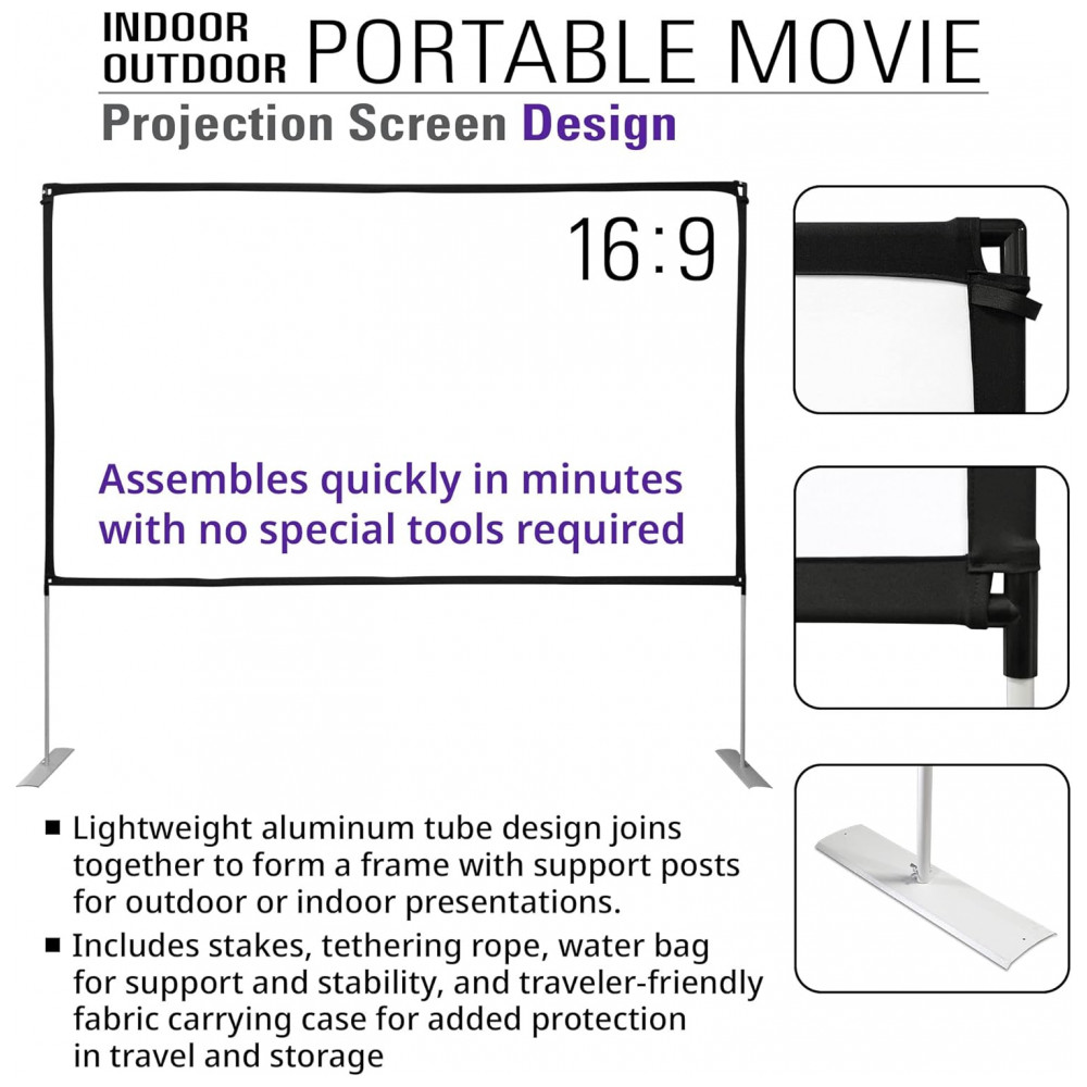Recursos adicionais: Tela lavável e dobrável, superfície tensionada para minimizar rugas, bordas pretas para melhor contraste, set de estacas, cordas e bolsa de água para estabilidade em uso externo
