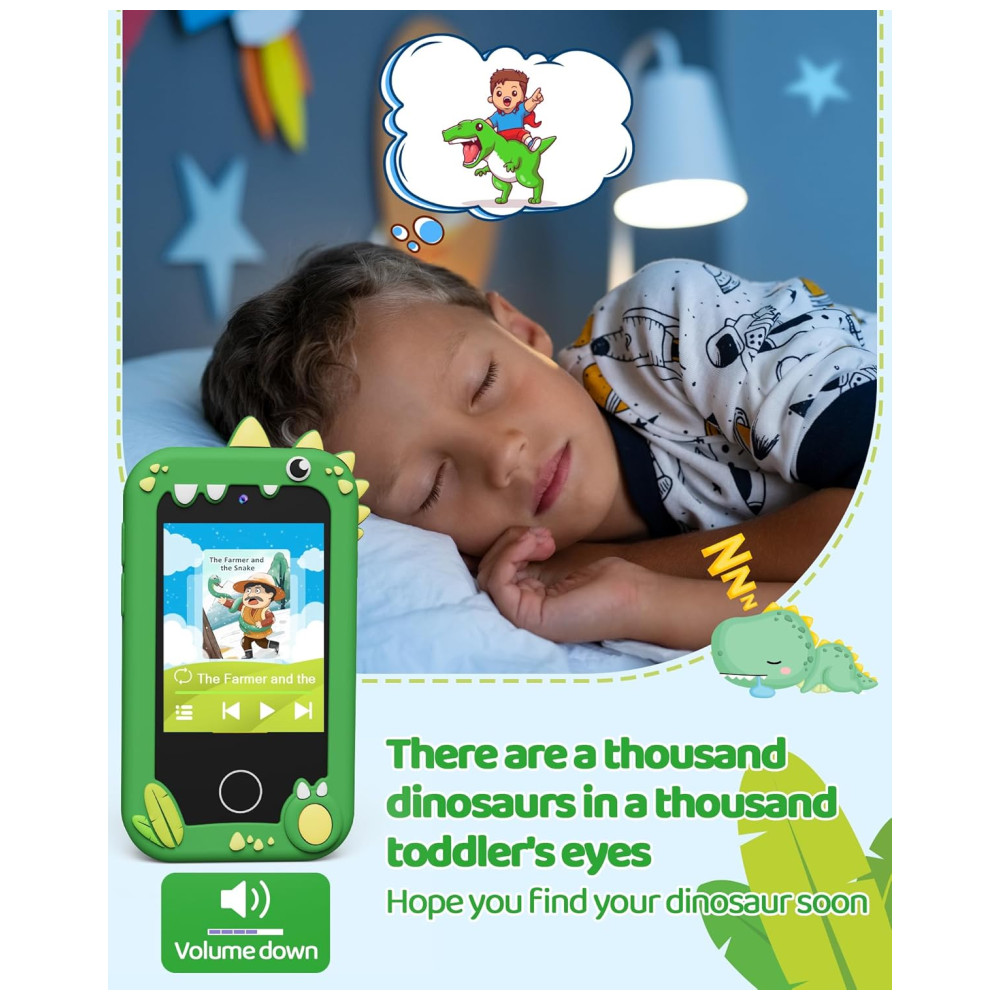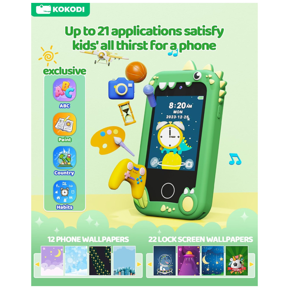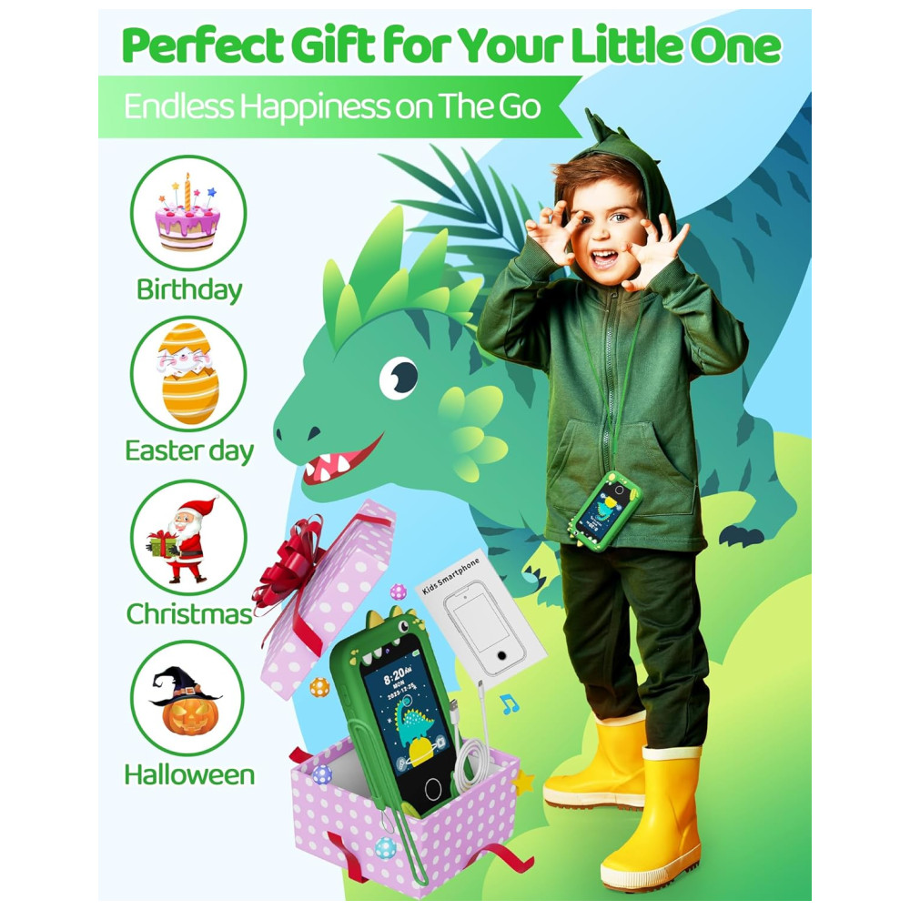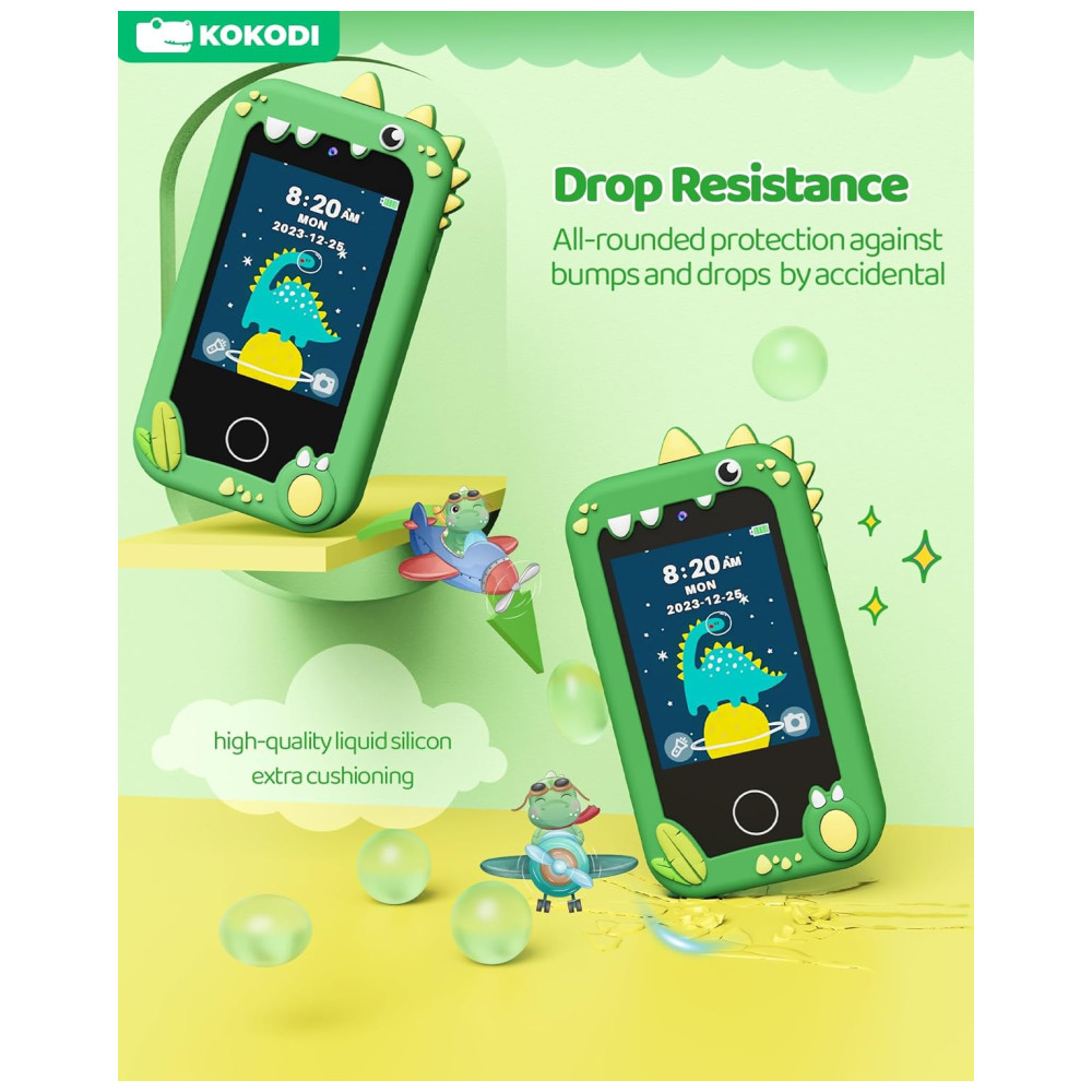 Telefone Brinquedo Infantil KOKODI Dinossauro Verde Tela Touchscreen HD Câmera Dupla Cartão SD 8GB Brinquedo Educativo Para Meninos de 3 a 10 Anos