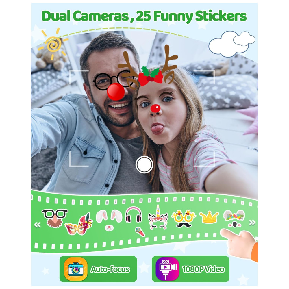 Brinquedo telefone infantil KOKODI oferece várias funções para crianças pequenas, incluindo fotos e vídeos com 12 megapixels e vídeo HD 1080p. Tela sensível ao toque de 2,8 polegadas (≈7,1 cm), trava automática em pessoas, animais e pássaros, e 23 adesivos divertidos para fotos. Vem com 13 jogos educativos pré-instalados em três níveis de dificuldade, além de milhares de músicas e centenas de histórias armazenadas em memória ampla. Capa de silicone protege contra quedas e facilita o manuseio. Ideal para crianças de 3 a 9 anos, perfeito para presentes de aniversário, Natal e outras ocasiões, promovendo diversão segura sem exposição a riscos digitais.