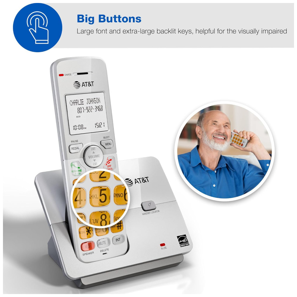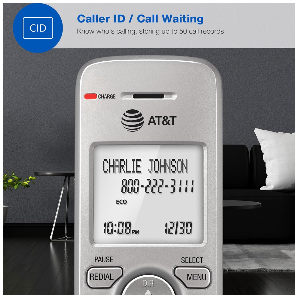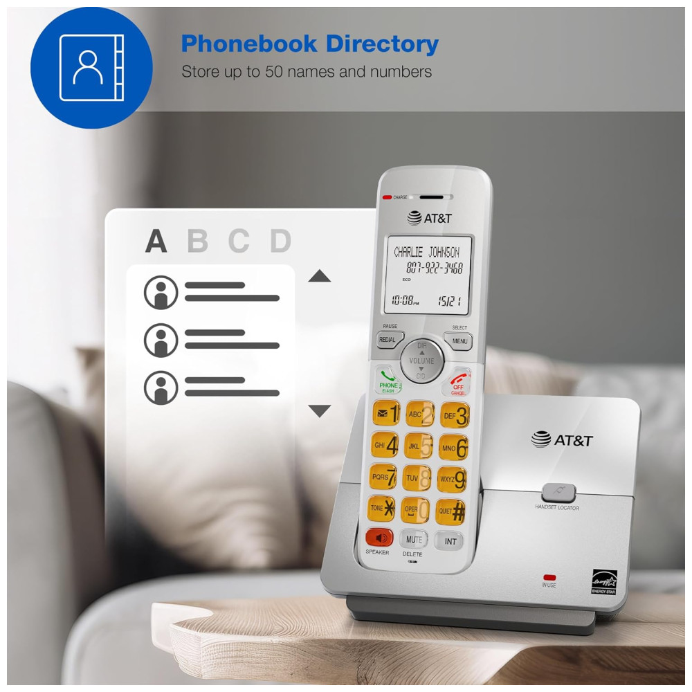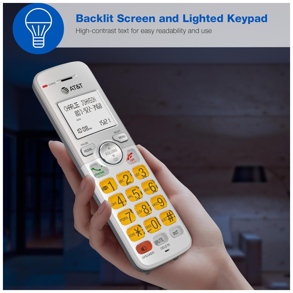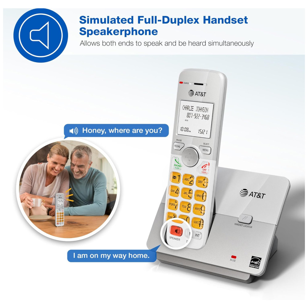 O Telefone Residencial Sem Fio AT&T EL51503 DECT 6.0 com Identificador de Chamadas e Viva-Voz no Aparelho foi projetado para oferecer todos os recursos que uma casa movimentada precisa. O viva-voz simulado em modo full duplex permite que ambas as partes falem e sejam ouvidas ao mesmo tempo, para conversas mais próximas da realidade. As chamadas com identificação de chamadas são exibidas em uma tela LCD grande e iluminada, para que você possa ver quem está ligando mesmo no escuro. A transmissão DECT 6.0 oferece som privado e livre de interferências de qualquer cômodo da sua casa. Com um alcance de operação estável de até 304 metros ao ar livre. O modo ECO gerencia o consumo de energia para que o sistema use menos energia e você obtenha a melhor vida útil da bateria. O visor retroiluminado e o teclado iluminado facilitam a leitura do identificador de chamadas ou registros do histórico de chamadas que podem ser armazenados no diretório do telefone. Além disso, o teclado iluminado permite discagem fácil em condições de pouca luz.