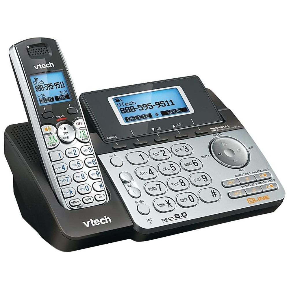 2 monofone Sistema de atendimento de duas linhas com identificador de chamadas duplo apresenta o deck 6. 0 tecnologia digital, viva voz para monofone e base, caixas de correio para cada linha e carimbos de data e hora da mensagem.