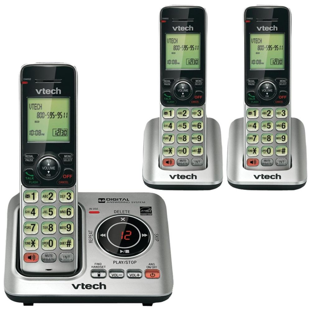 VTech CS6629 3 Telefone sem fio expansível DECT 6.0 com sistema de atendimento e identificador de chamadas , chamada em espera, prateado com 3 aparelhos