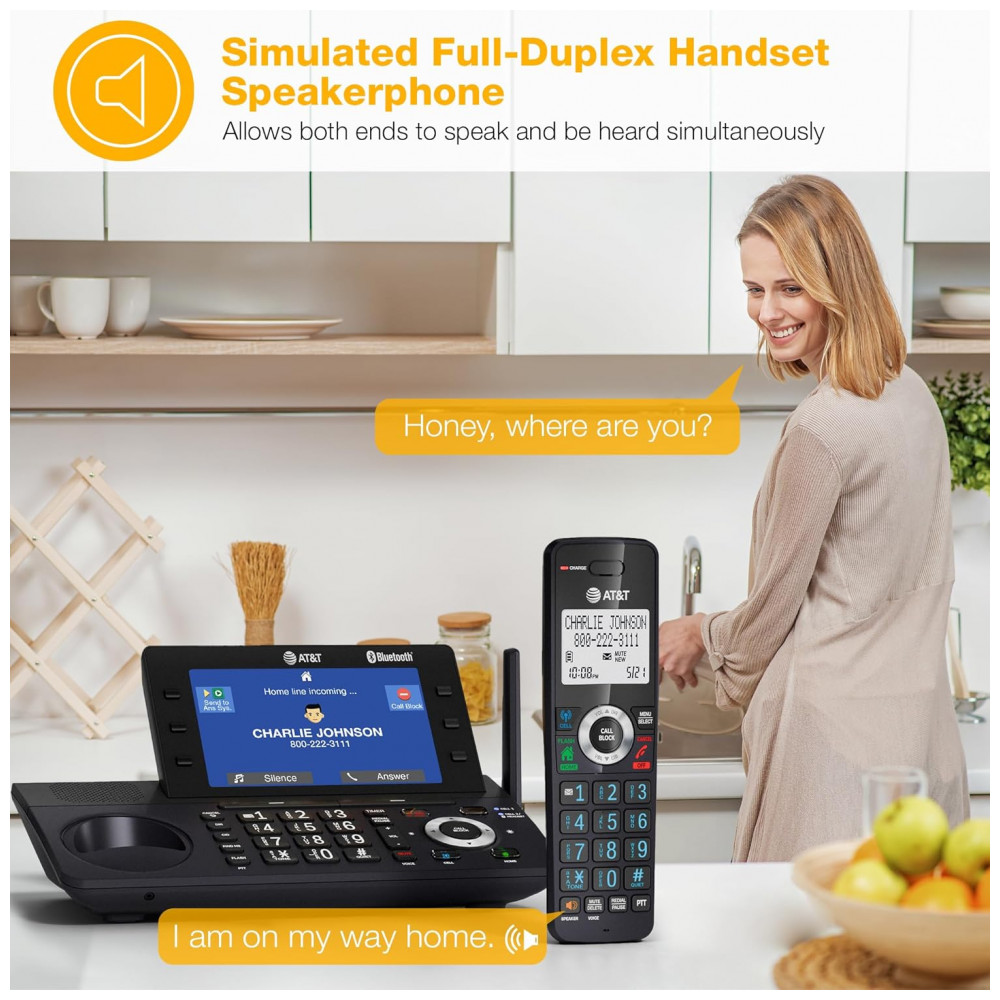 Possui bloqueador inteligente de chamadas que bloqueia robocalls automaticamente na primeira ocorrência, blacklist de um toque para até 1.000 números e compatibilidade Bluetooth Connect to Cell para emparelhar até 2 celulares ou 1 celular + 1 headset, permitindo chamadas móveis via handsets. A secretária digital digital armazena até 40 minutos de gravação, com viva-voz simulado full-duplex nos handsets e base para conversas simultâneas.