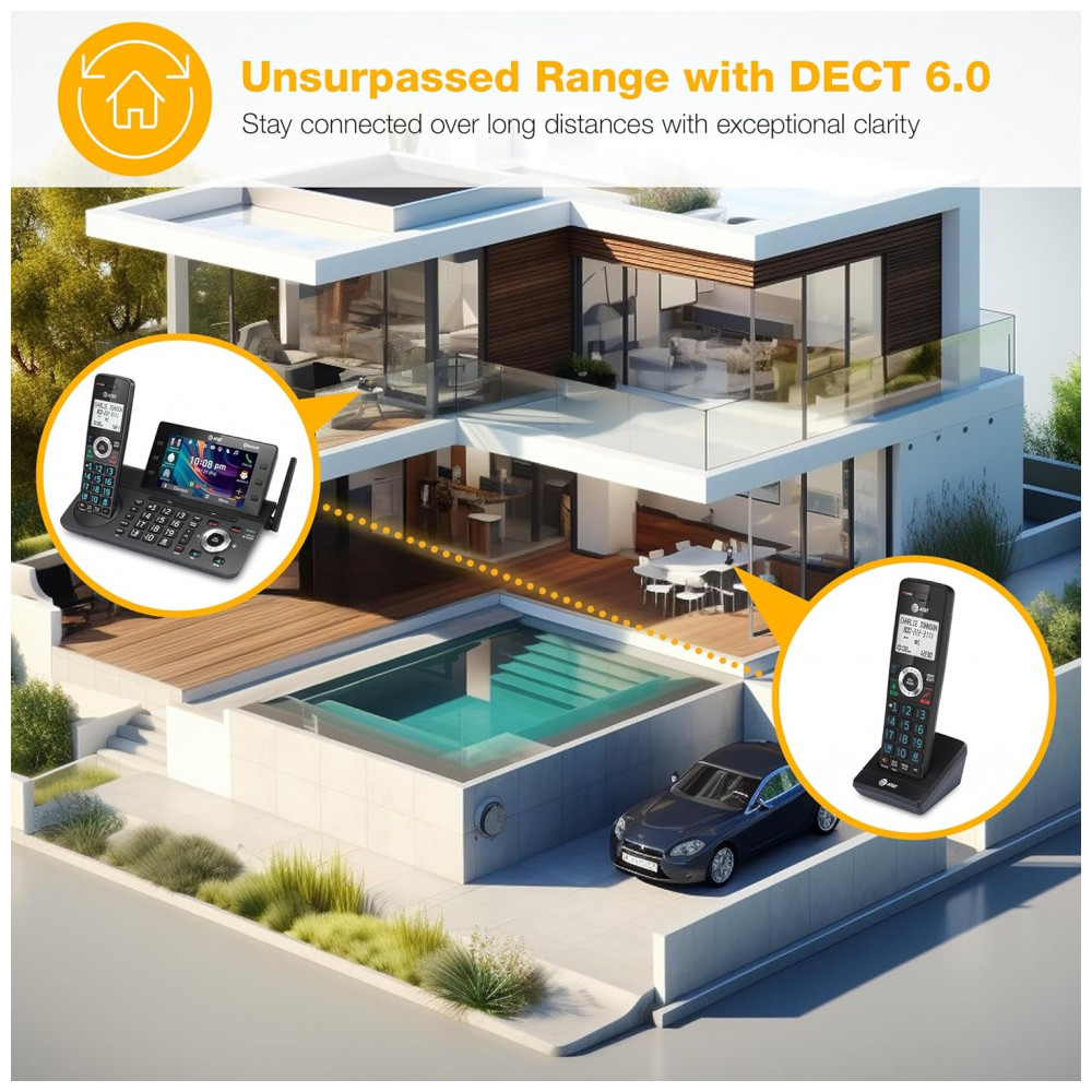 O telefone sem fio AT&T DLP73590 utiliza tecnologia DECT 6.0 com design de antena única para alcance estendido e filtragem avançada de ruído, suportando operação multi-linha expansível. A base possui tela colorida de 5 polegadas com teclas suaves para navegação de menu, atalhos personalizados de um toque para contatos, mensagens, histórico de chamadas e timer, além de conferência entre linha externa e até 4 handsets com intercomunicador entre handsets e base.