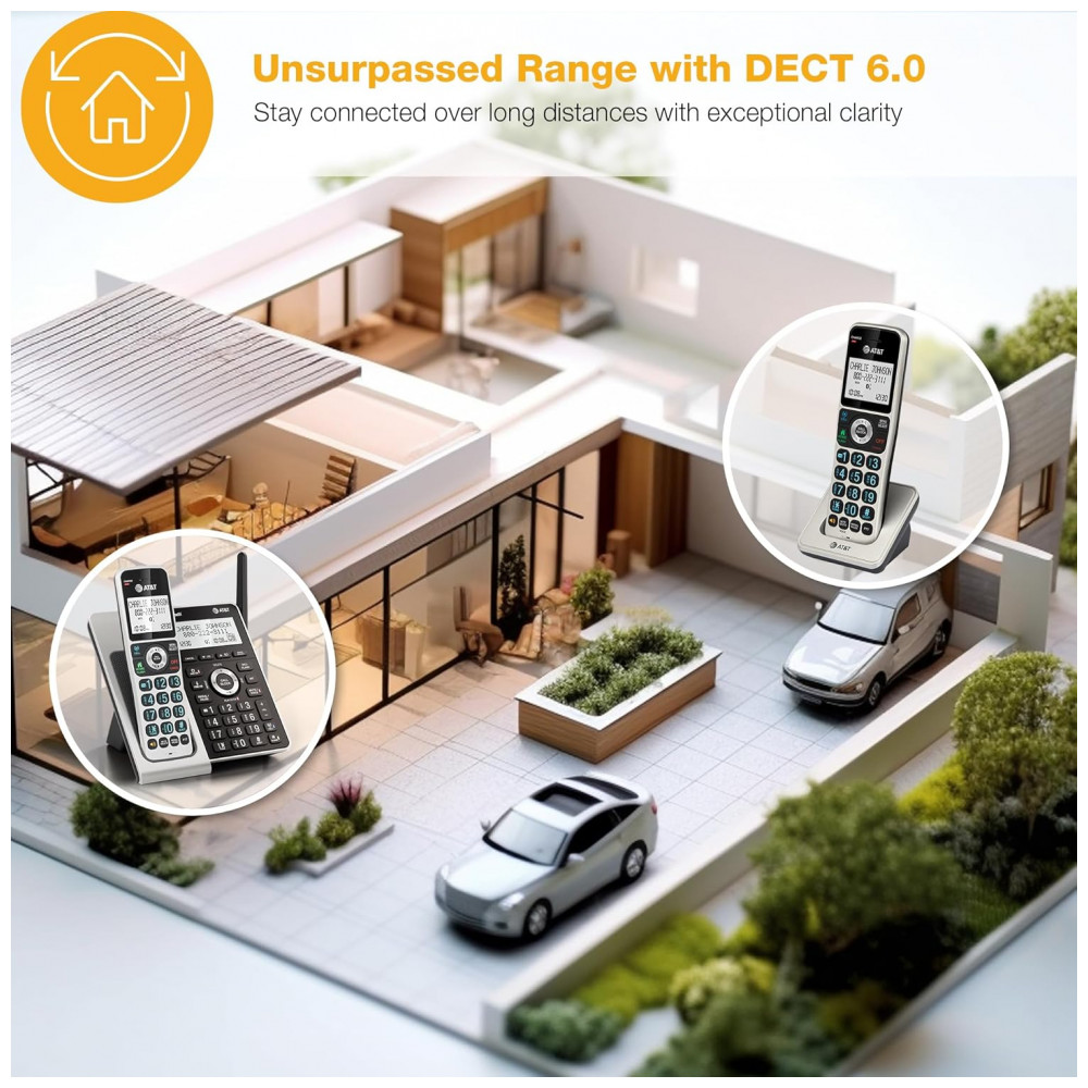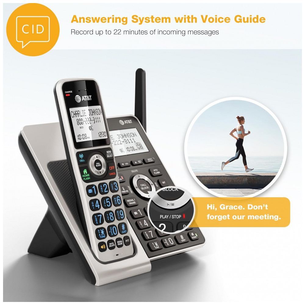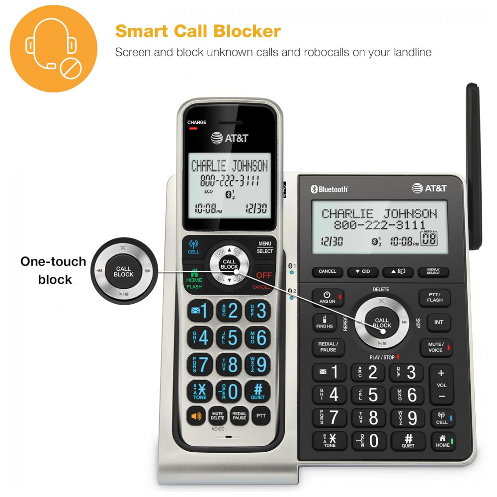 O bloqueador de chamadas inteligente identifica e filtra robocalls e números desconhecidos, com capacidade para armazenar até 1.000 contatos na lista de bloqueio e tecla dedicada para bloqueio instantâneo. A secretária eletrônica digital suporta 22 minutos de gravação para mensagens recebidas e memos, com interface guiada por voz para configuração e reprodução.