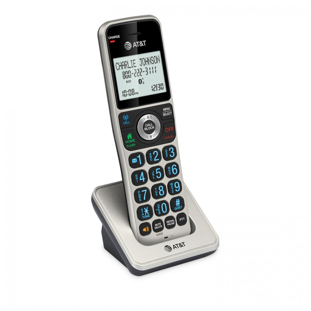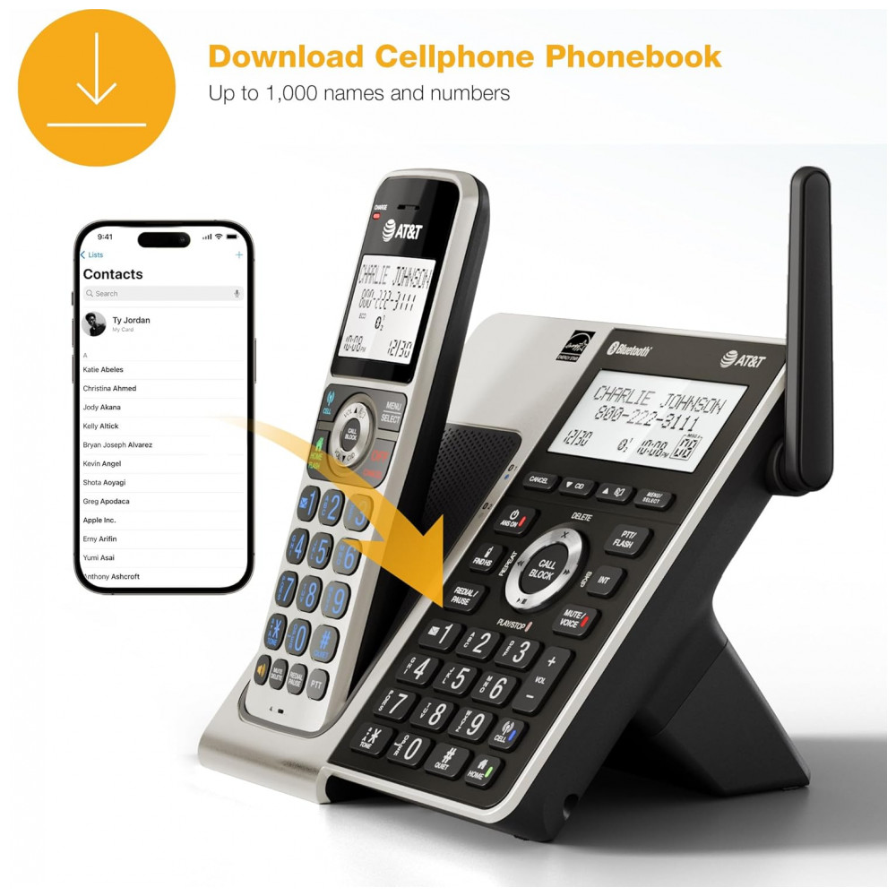 Displays retroiluminados de 5,1 cm nos terminais e base exibem texto de alto contraste; teclados iluminados facilitam a discagem em condições de pouca luz. Permite download de contatos da agenda do celular via Bluetooth. Opera em linha única com suporte a conferência básica e identificador de chamadas com histórico. Inclui 3 terminais, 3 adaptadores AC 120 V CA, 2 carregadores, base, cabo de linha telefônica e 3 pacotes de baterias recarregáveis.