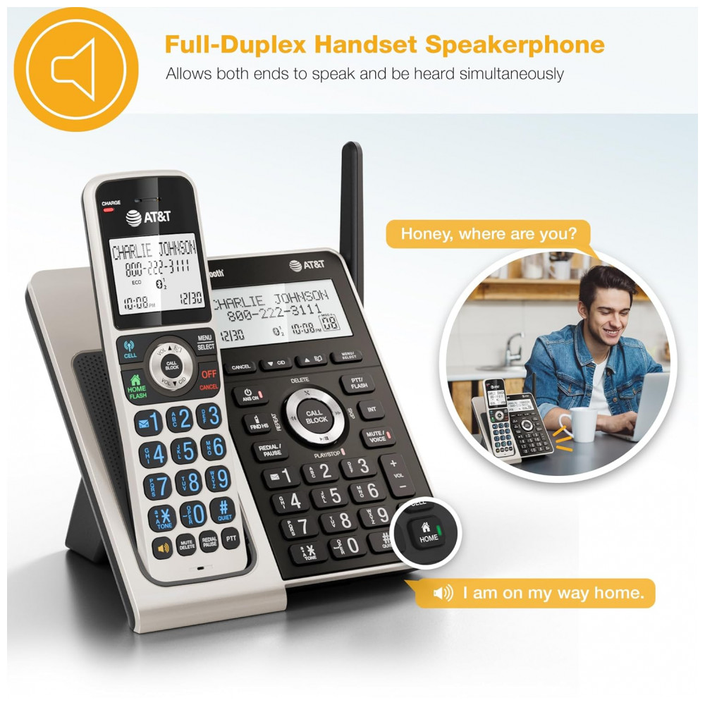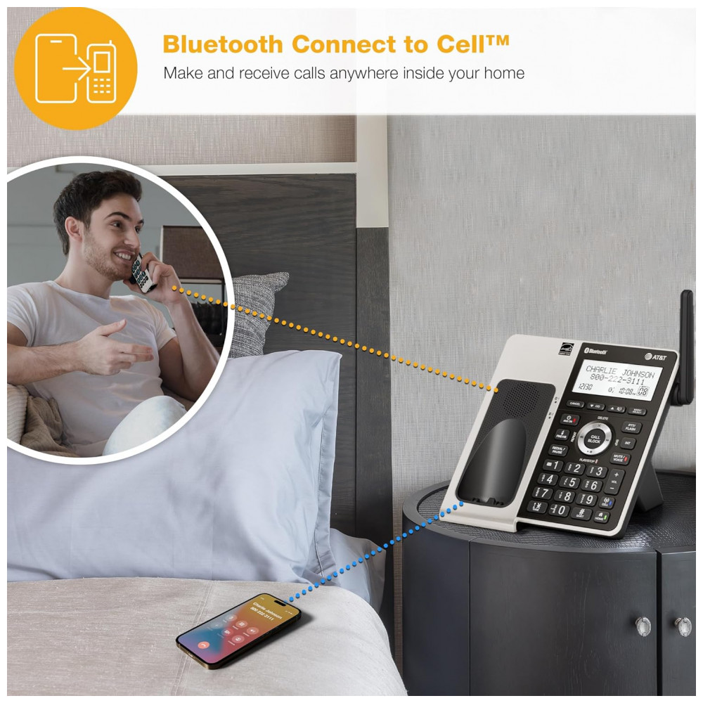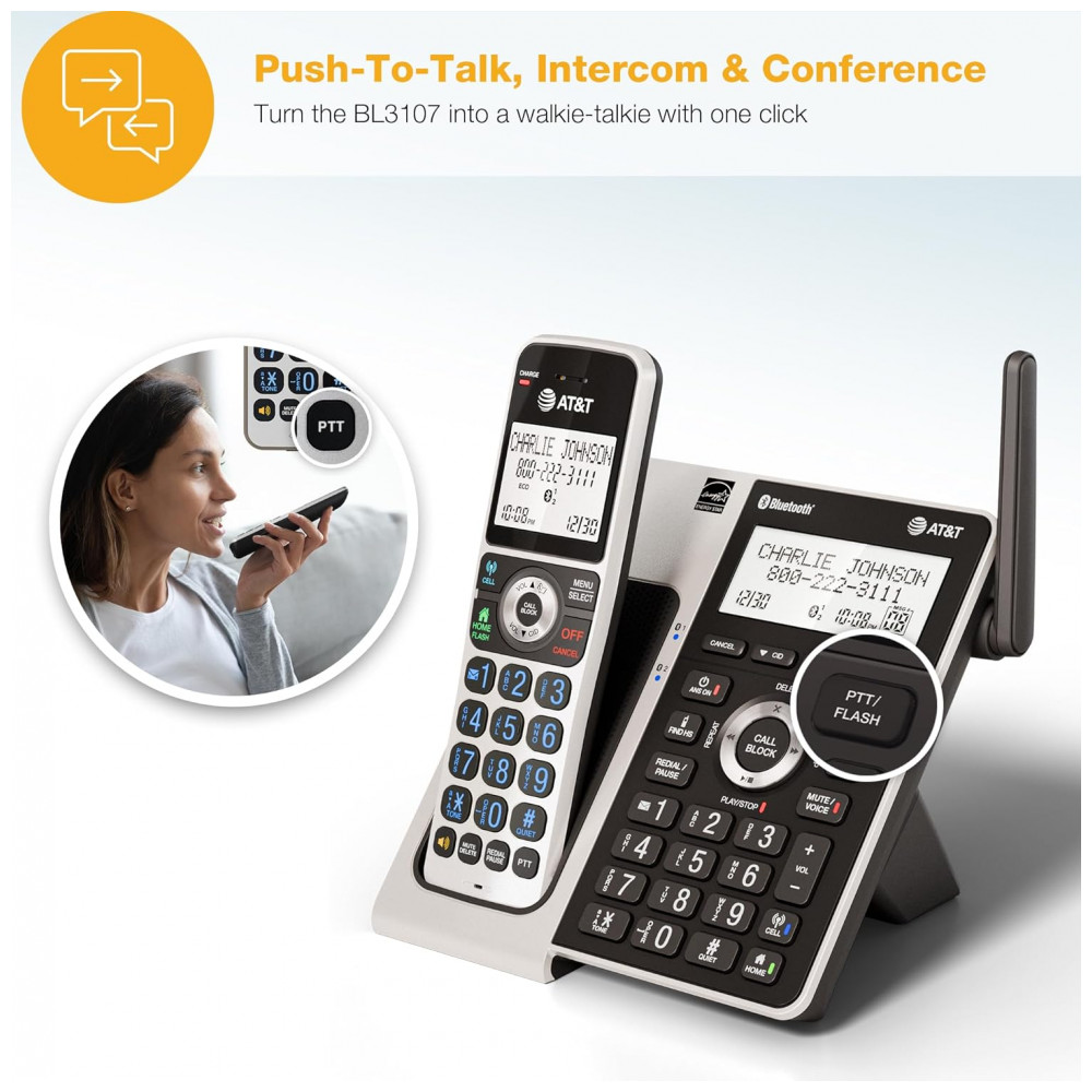 O sistema telefônico AT&T BL3107-3 inclui 3 terminais portáteis conectados à base principal via tecnologia DECT 6.0 para alcance ampliado em linhas telefônicas fixas padrão. Suporta conexão Bluetooth com até 2 smartphones ou 1 smartphone + 1 headset, permitindo realizar e receber chamadas fixas e móveis diretamente dos terminais, com acesso a assistentes de voz.